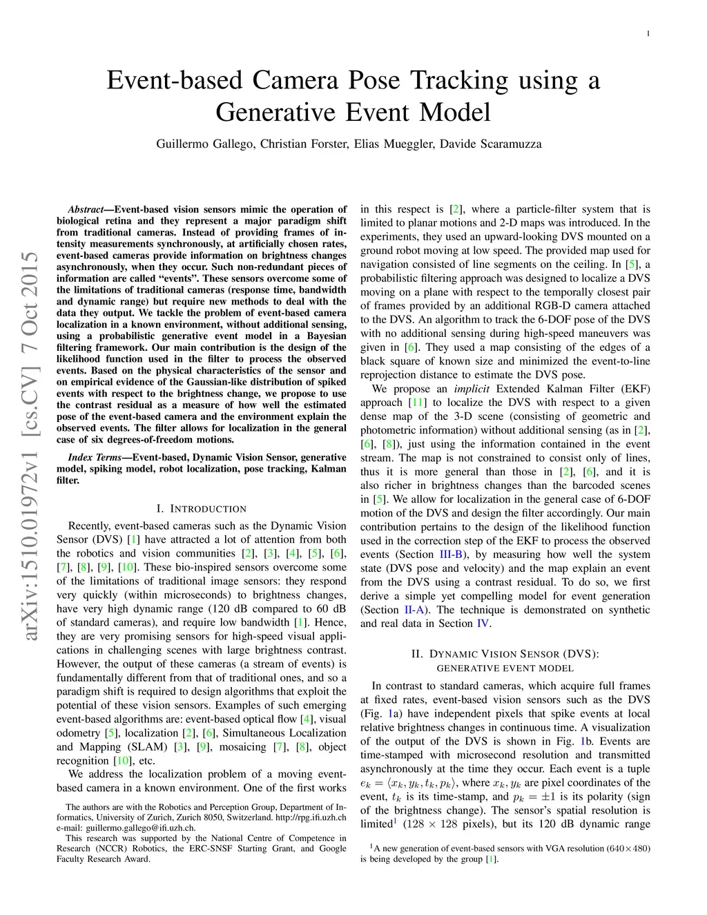 Event-based vision sensors mimic the operation of biological retina and they represent a major paradigm shift from traditional cameras. Instead of providing frames of intensity measurements synchronously, at artificially chosen rates, event-based cameras provide information on brightness changes asynchronously, when they occur. Such non-redundant pieces of information are called "events". These sensors overcome some of the limitations of traditional cameras (response time, bandwidth and dynamic range) but require new methods to deal with the data they output. We tackle the problem of event-based camera localization in a known environment, without additional sensing, using a probabilistic generative event model in a Bayesian filtering framework. Our main contribution is the design of the likelihood function used in the filter to process the observed events. Based on the physical characteristics of the sensor and on empirical evidence of the Gaussian-like distribution of spiked events with respect to the brightness change, we propose to use the contrast residual as a measure of how well the estimated pose of the event-based camera and the environment explain the observed events. The filter allows for localization in the general case of six degrees-of-freedom motions.