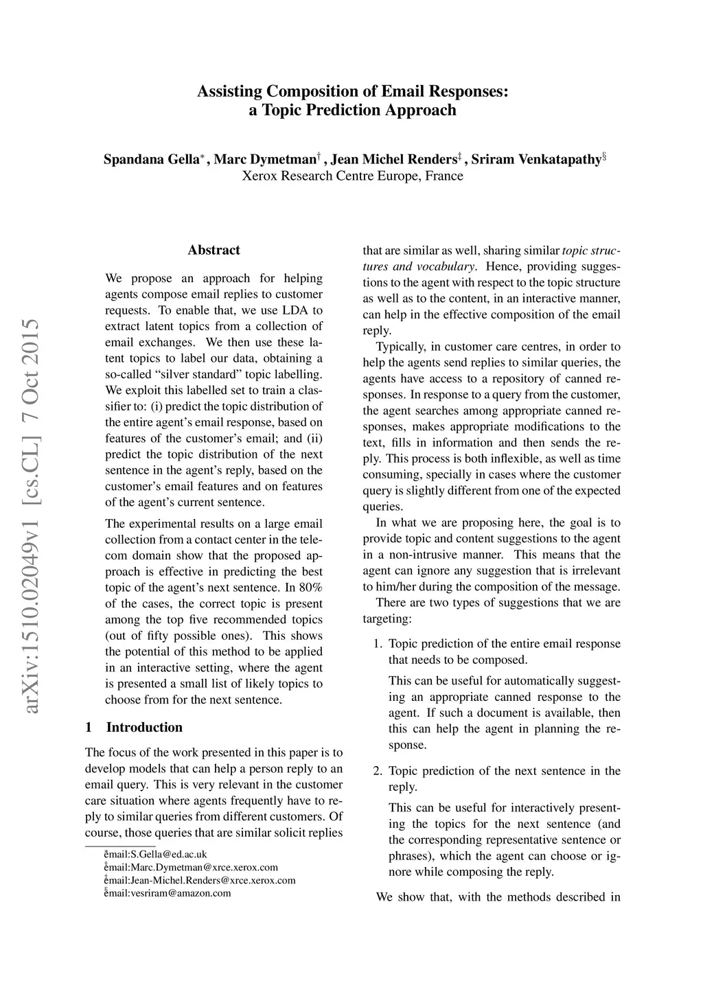 Assisting Composition of Email Responses: a Topic Prediction Approach
