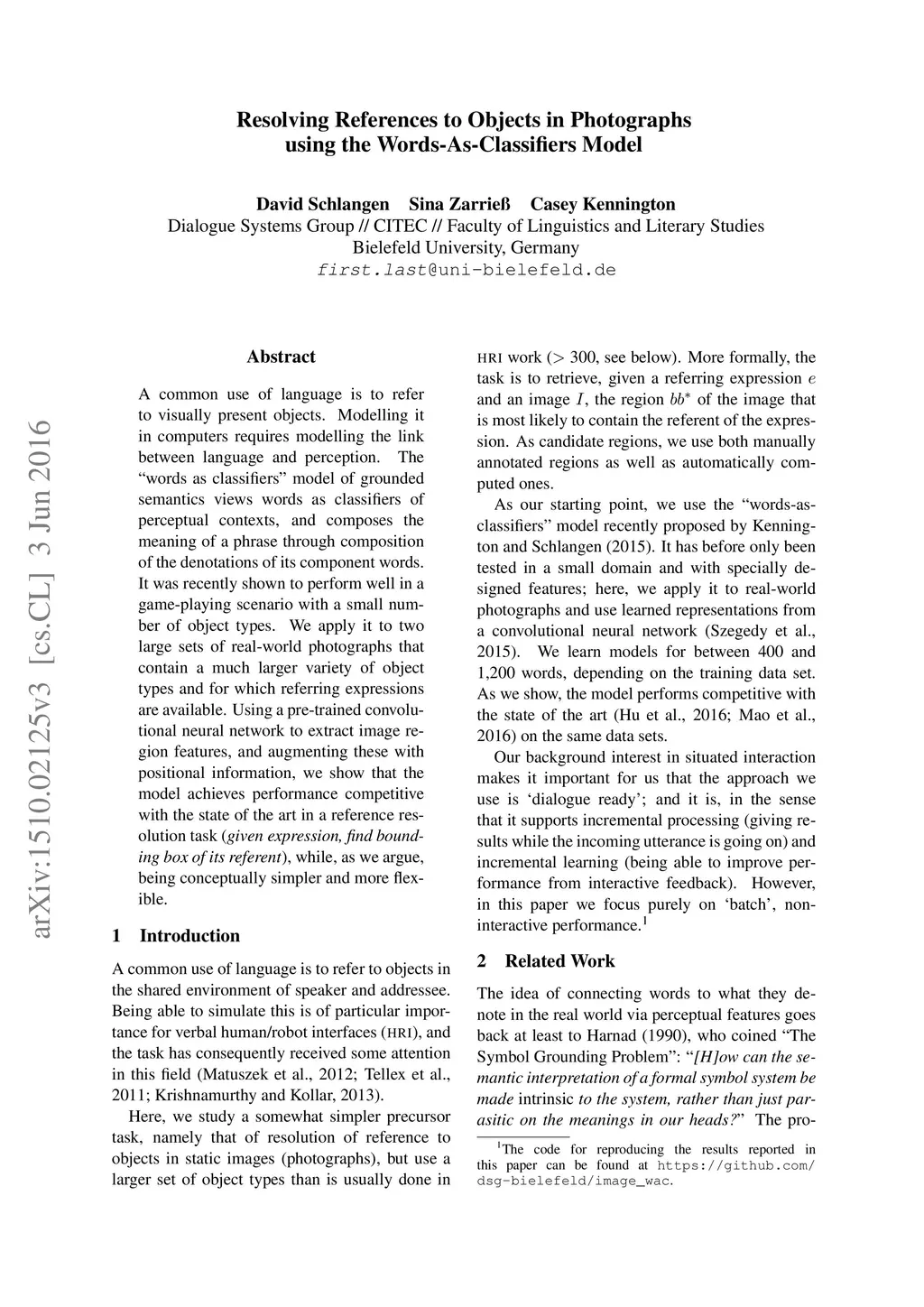 A common use of language is to refer to visually present objects. Modelling it in computers requires modelling the link between language and perception. The "words as classifiers" model of grounded semantics views words as classifiers of perceptual contexts, and composes the meaning of a phrase through composition of the denotations of its component words. It was recently shown to perform well in a game-playing scenario with a small number of object types. We apply it to two large sets of real-world photographs that contain a much larger variety of types and for which referring expressions are available. Using a pre-trained convolutional neural network to extract image features, and augmenting these with in-picture positional information, we show that the model achieves performance competitive with the state of the art in a reference resolution task (given expression, find bounding box of its referent), while, as we argue, being conceptually simpler and more flexible.