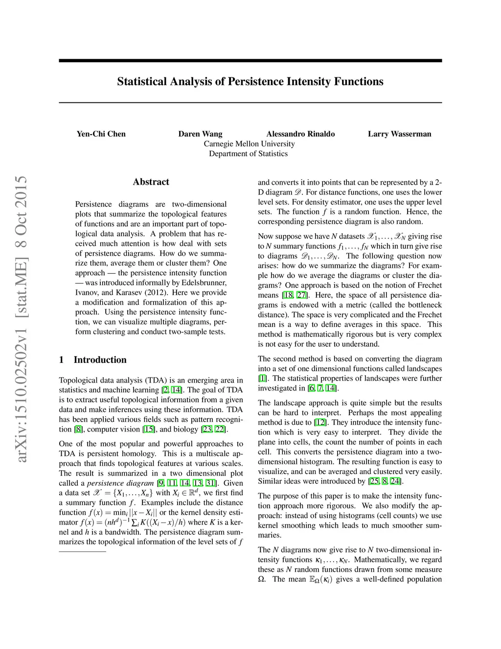 Persistence diagrams are two-dimensional plots that summarize the topological features of functions and are an important part of topological data analysis. A problem that has received much attention is how deal with sets of persistence diagrams. How do we summarize them, average them or cluster them? One approach -- the persistence intensity function -- was introduced informally by Edelsbrunner, Ivanov, and Karasev (2012). Here we provide a modification and formalization of this approach. Using the persistence intensity function, we can visualize multiple diagrams, perform clustering and conduct two-sample tests.