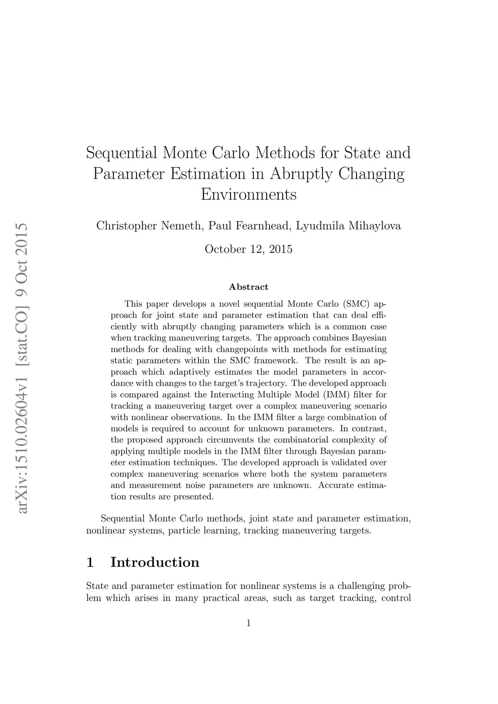This paper develops a novel sequential Monte Carlo (SMC) approach for joint state and parameter estimation that can deal efficiently with abruptly changing parameters which is a common case when tracking maneuvering targets. The approach combines Bayesian methods for dealing with changepoints with methods for estimating static parameters within the SMC framework. The result is an approach which adaptively estimates the model parameters in accordance with changes to the target's trajectory. The developed approach is compared against the Interacting Multiple Model (IMM) filter for tracking a maneuvering target over a complex maneuvering scenario with nonlinear observations. In the IMM filter a large combination of models is required to account for unknown parameters. In contrast, the proposed approach circumvents the combinatorial complexity of applying multiple models in the IMM filter through Bayesian parameter estimation techniques. The developed approach is validated over complex maneuvering scenarios where both the system parameters and measurement noise parameters are unknown. Accurate estimation results are presented.