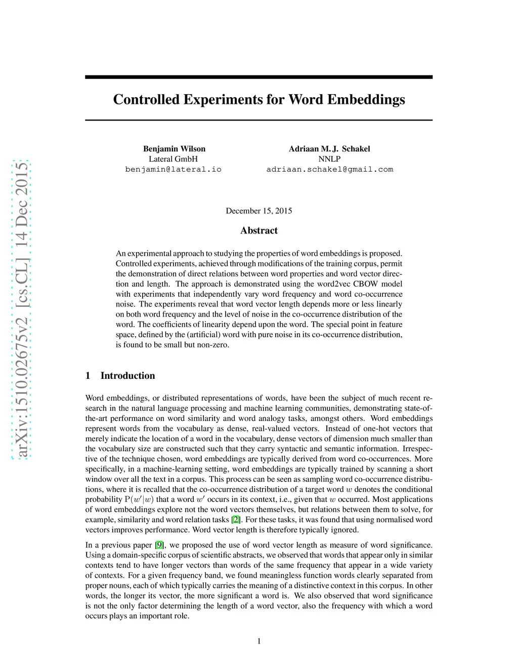 An experimental approach to studying the properties of word embeddings is proposed. Controlled experiments, achieved through modifications of the training corpus, permit the demonstration of direct relations between word properties and word vector direction and length. The approach is demonstrated using the word2vec CBOW model with experiments that independently vary word frequency and word co-occurrence noise. The experiments reveal that word vector length depends more or less linearly on both word frequency and the level of noise in the co-occurrence distribution of the word. The coefficients of linearity depend upon the word. The special point in feature space, defined by the (artificial) word with pure noise in its co-occurrence distribution, is found to be small but non-zero.