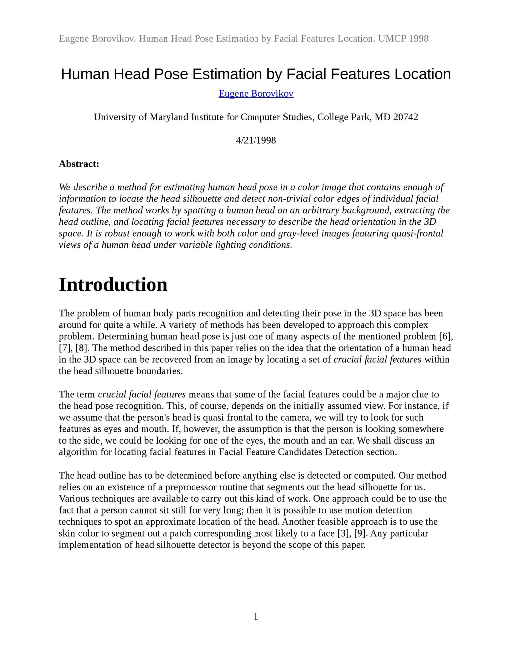 We describe a method for estimating human head pose in a color image that contains enough of information to locate the head silhouette and detect non-trivial color edges of individual facial features. The method works by spotting the human head on an arbitrary background, extracting the head outline, and locating facial features necessary to describe the head orientation in the 3D space. It is robust enough to work with both color and gray-level images featuring quasi-frontal views of a human head under variable lighting conditions.