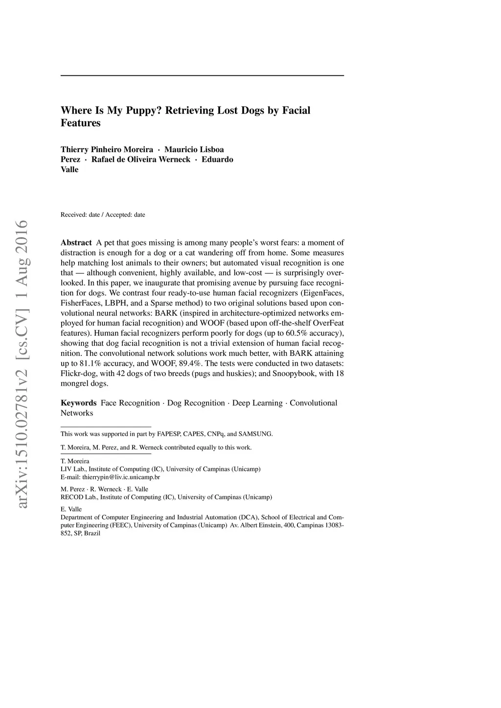 A pet that goes missing is among many people's worst fears: a moment of distraction is enough for a dog or a cat wandering off from home. Some measures help matching lost animals to their owners; but automated visual recognition is one that - although convenient, highly available, and low-cost - is surprisingly overlooked. In this paper, we inaugurate that promising avenue by pursuing face recognition for dogs. We contrast four ready-to-use human facial recognizers (EigenFaces, FisherFaces, LBPH, and a Sparse method) to two original solutions based upon convolutional neural networks: BARK (inspired in architecture-optimized networks employed for human facial recognition) and WOOF (based upon off-the-shelf OverFeat features). Human facial recognizers perform poorly for dogs (up to 60.5% accuracy), showing that dog facial recognition is not a trivial extension of human facial recognition. The convolutional network solutions work much better, with BARK attaining up to 81.1% accuracy, and WOOF, 89.4%. The tests were conducted in two datasets: Flickr-dog, with 42 dogs of two breeds (pugs and huskies); and Snoopybook, with 18 mongrel dogs.