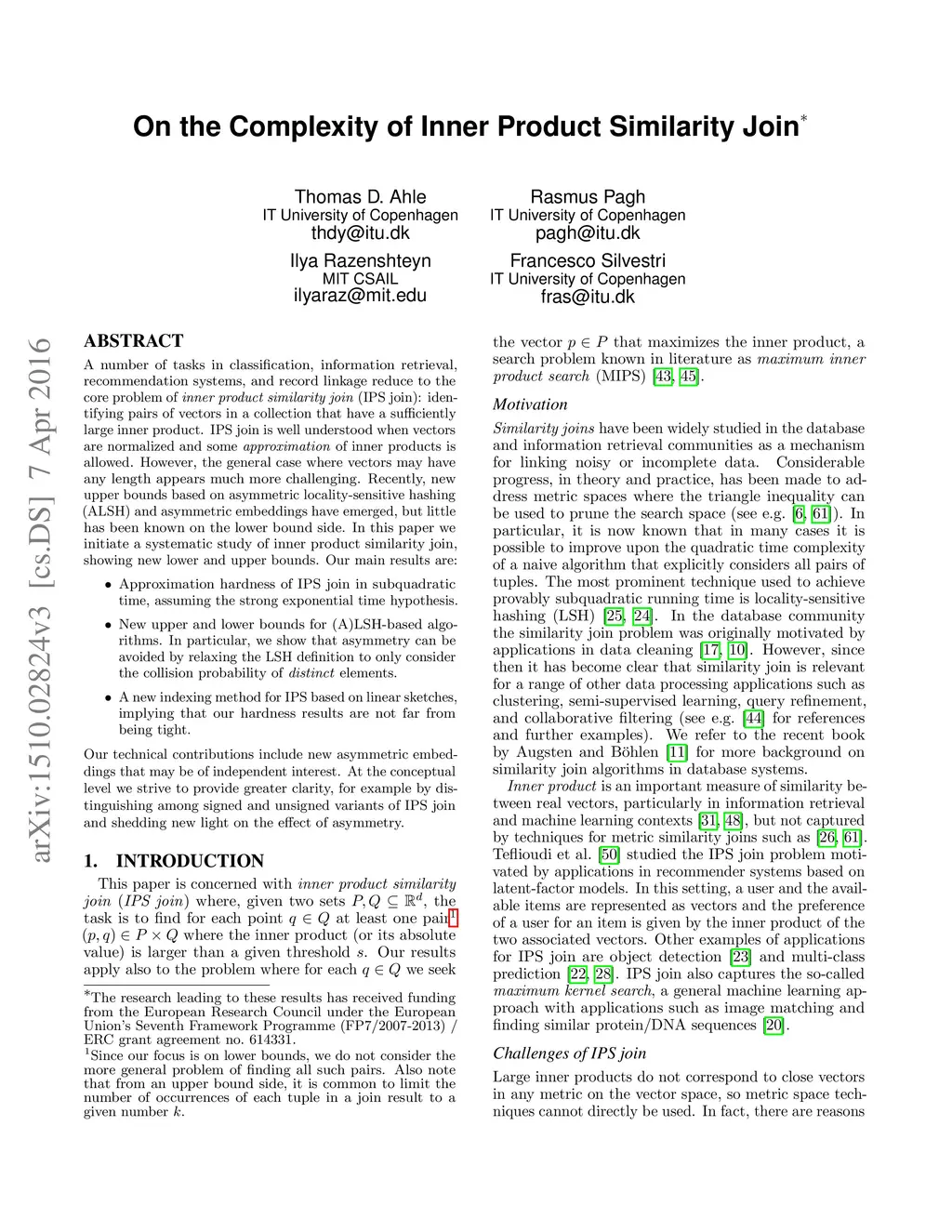 A number of tasks in classification, information retrieval, recommendation systems, and record linkage reduce to the core problem of inner product similarity join (IPS join): identifying pairs of vectors in a collection that have a sufficiently large inner product. IPS join is well understood when vectors are normalized and some approximation of inner products is allowed. However, the general case where vectors may have any length appears much more challenging. Recently, new upper bounds based on asymmetric locality-sensitive hashing (ALSH) and asymmetric embeddings have emerged, but little has been known on the lower bound side. In this paper we initiate a systematic study of inner product similarity join, showing new lower and upper bounds. Our main results are: * Approximation hardness of IPS join in subquadratic time, assuming the strong exponential time hypothesis. * New upper and lower bounds for (A)LSH-based algorithms. In particular, we show that asymmetry can be avoided by relaxing the LSH definition to only consider the collision probability of distinct elements. * A new indexing method for IPS based on linear sketches, implying that our hardness results are not far from being tight. Our technical contributions include new asymmetric embeddings that may be of independent interest. At the conceptual level we strive to provide greater clarity, for example by distinguishing among signed and unsigned variants of IPS join and shedding new light on the effect of asymmetry.