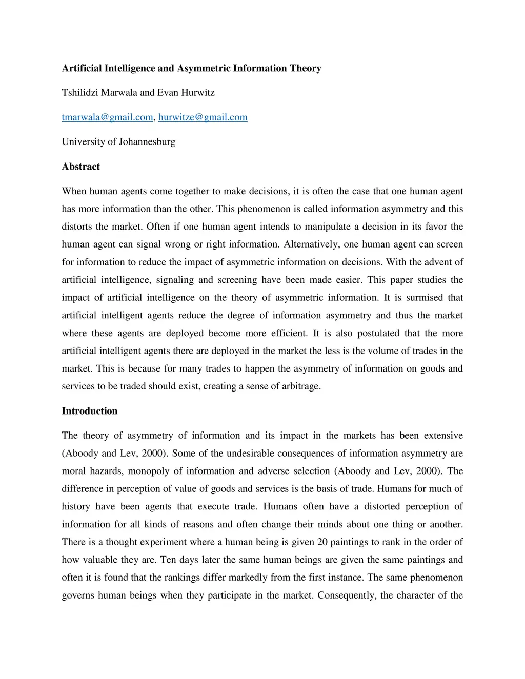 When human agents come together to make decisions, it is often the case that one human agent has more information than the other. This phenomenon is called information asymmetry and this distorts the market. Often if one human agent intends to manipulate a decision in its favor the human agent can signal wrong or right information. Alternatively, one human agent can screen for information to reduce the impact of asymmetric information on decisions. With the advent of artificial intelligence, signaling and screening have been made easier. This paper studies the impact of artificial intelligence on the theory of asymmetric information. It is surmised that artificial intelligent agents reduce the degree of information asymmetry and thus the market where these agents are deployed become more efficient. It is also postulated that the more artificial intelligent agents there are deployed in the market the less is the volume of trades in the market. This is because for many trades to happen the asymmetry of information on goods and services to be traded should exist, creating a sense of arbitrage.