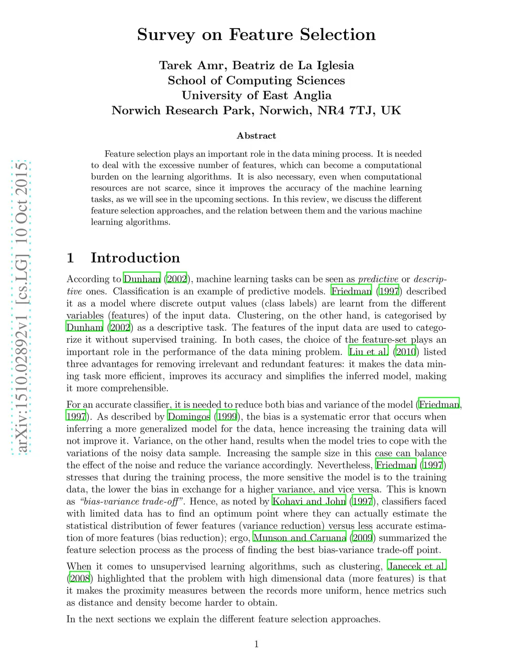 Feature selection plays an important role in the data mining process. It is needed to deal with the excessive number of features, which can become a computational burden on the learning algorithms. It is also necessary, even when computational resources are not scarce, since it improves the accuracy of the machine learning tasks, as we will see in the upcoming sections. In this review, we discuss the different feature selection approaches, and the relation between them and the various machine learning algorithms.