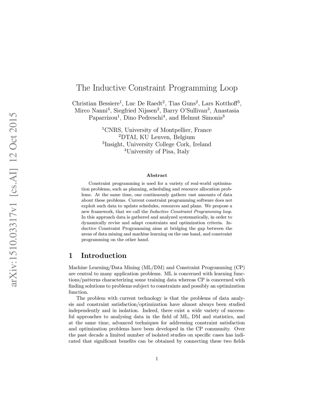 Constraint programming is used for a variety of real-world optimisation problems, such as planning, scheduling and resource allocation problems. At the same time, one continuously gathers vast amounts of data about these problems. Current constraint programming software does not exploit such data to update schedules, resources and plans. We propose a new framework, that we call the Inductive Constraint Programming loop. In this approach data is gathered and analyzed systematically, in order to dynamically revise and adapt constraints and optimization criteria. Inductive Constraint Programming aims at bridging the gap between the areas of data mining and machine learning on the one hand, and constraint programming on the other hand.