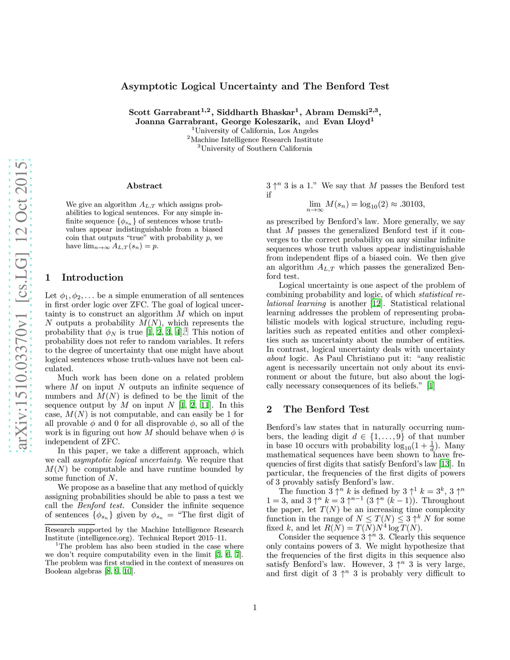 Asymptotic Logical Uncertainty and The Benford Test