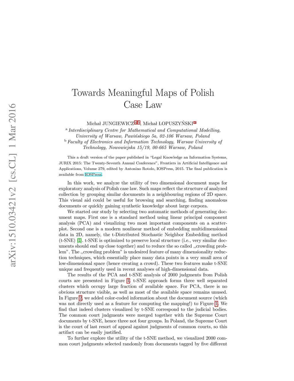 In this work, we analyze the utility of two dimensional document maps for exploratory analysis of Polish case law. We start by comparing two methods of generating such visualizations. First is based on linear principal component analysis (PCA). Second makes use of the modern nonlinear t-Distributed Stochastic Neighbor Embedding method (t-SNE). We apply both PCA and t-SNE to a corpus of judgments from different courts in Poland. It emerges that t-SNE provides better, more interpretable results than PCA. As a next test, we apply t-SNE to randomly selected sample of common court judgments corresponding to different keywords. We show that t-SNE, in this case, reveals hidden topical structure of the documents related to keyword,,pension". In conclusion, we find that the t-SNE method could be a promising tool to facilitate the exploitative analysis of legal texts, e.g., by complementing search or browse functionality in legal databases.