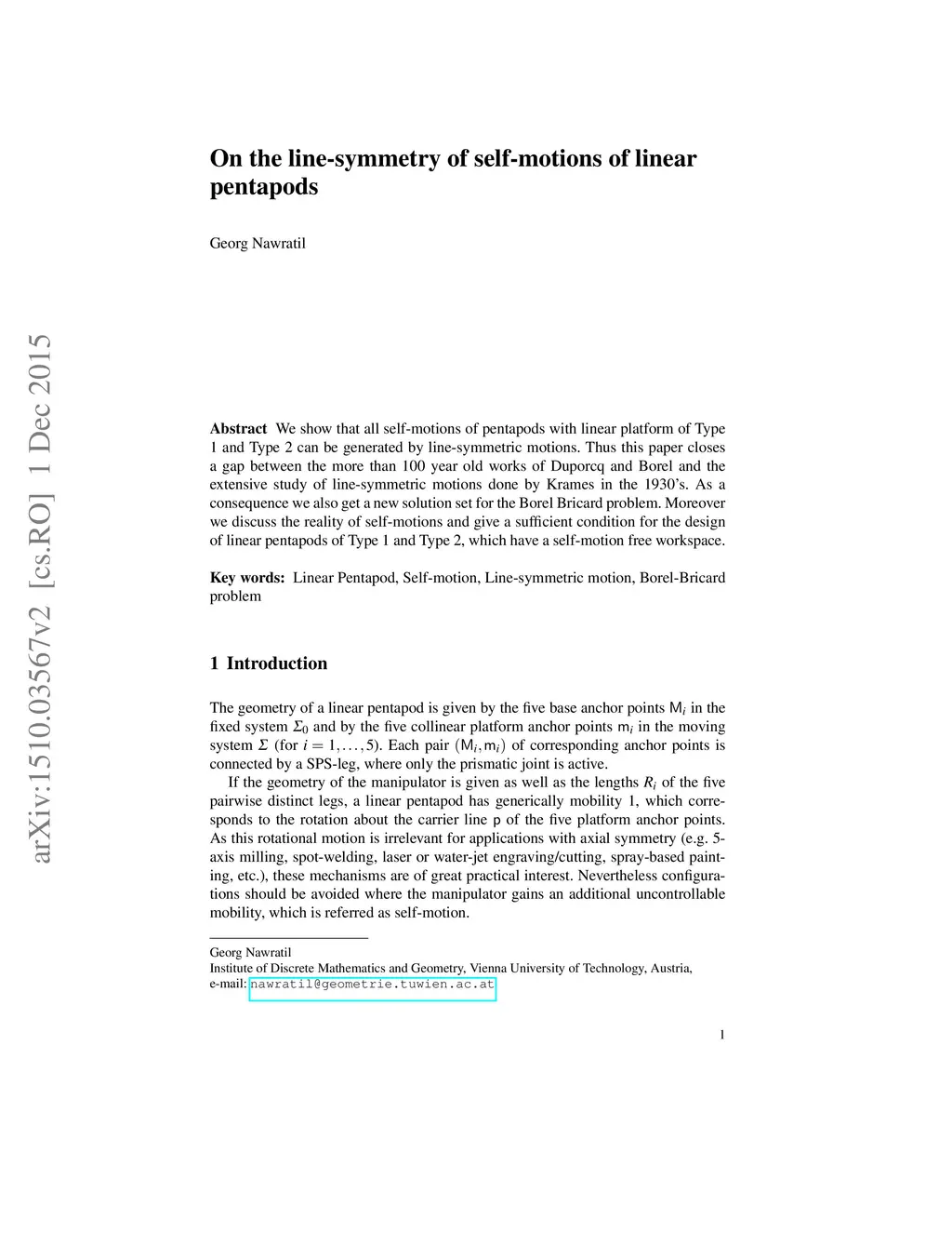 We show that all self-motions of pentapods with linear platform of Type 1 and Type 2 can be generated by line-symmetric motions. Thus this paper closes a gap between the more than 100 year old works of Duporcq and Borel and the extensive study of line-symmetric motions done by Krames in the 1930's. As a consequence we also get a new solution set for the Borel Bricard problem. Moreover we discuss the reality of self-motions and give a sufficient condition for the design of linear pentapods of Type 1 and Type 2, which have a self-motion free workspace.
