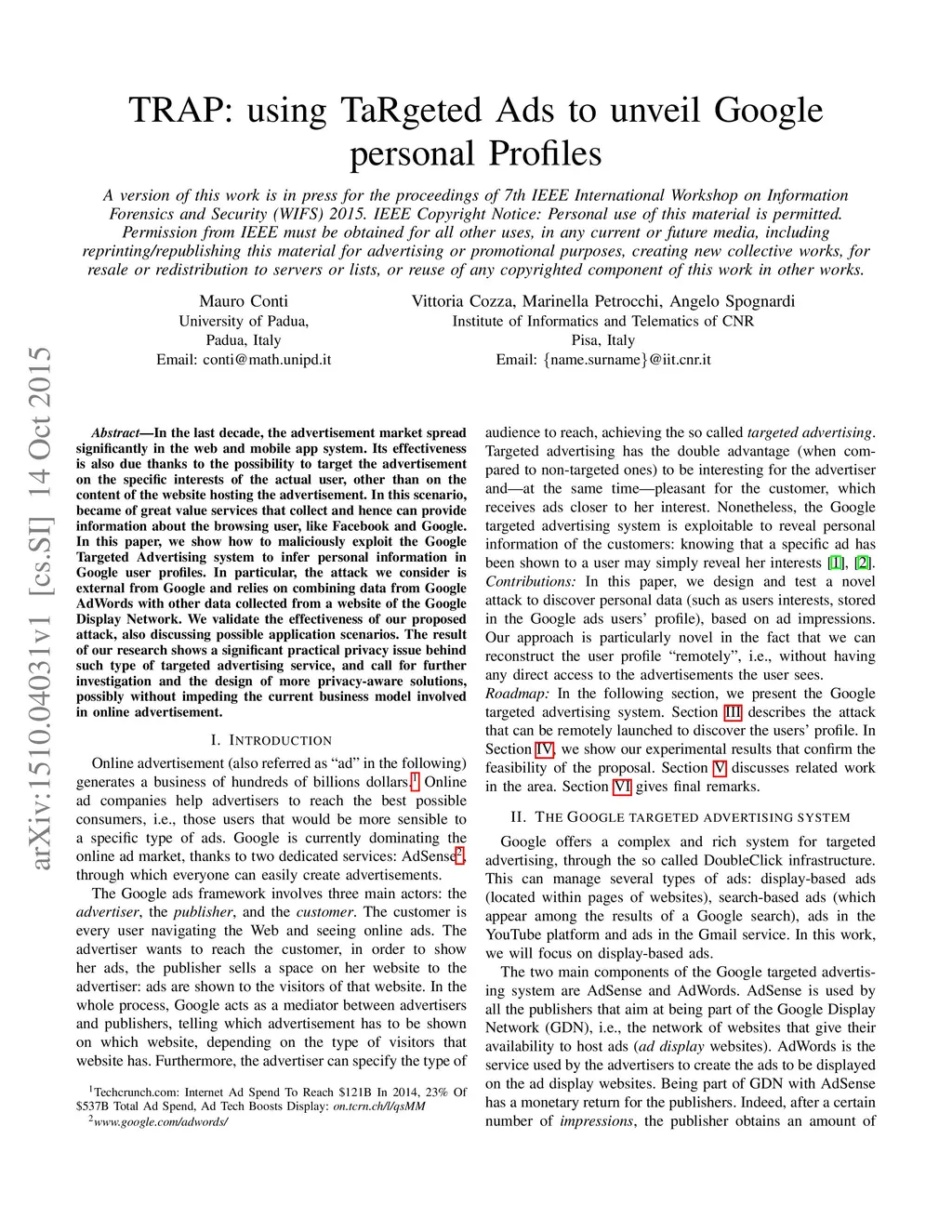 TRAP: using TaRgeted Ads to unveil Google personal Profiles