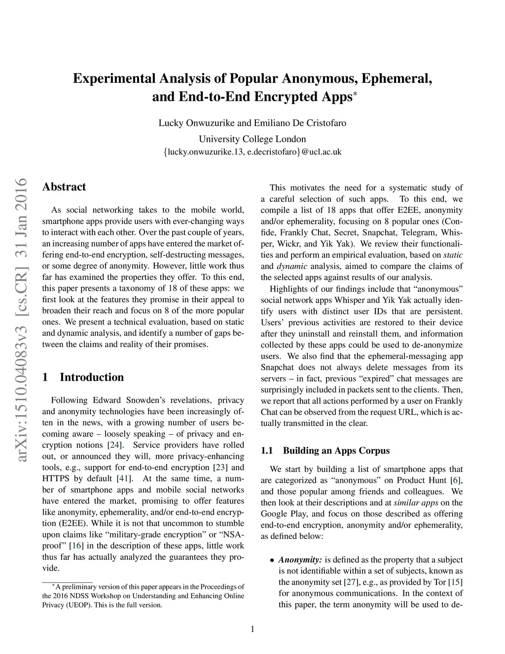 Experimental Analysis of Popular Smartphone Apps Offering Anonymity,