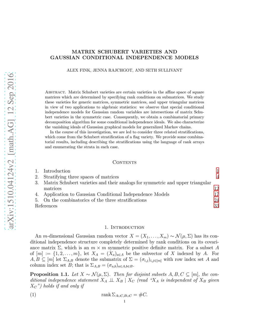 Matrix Schubert varieties are certain varieties in the affine space of square matrices which are determined by specifying rank conditions on submatrices. We study these varieties for generic matrices, symmetric matrices, and upper triangular matrices in view of two applications to algebraic statistics: we observe that special conditional independence models for Gaussian random variables are intersections of matrix Schubert varieties in the symmetric case. Consequently, we obtain a combinatorial primary decomposition algorithm for some conditional independence ideals. We also characterize the vanishing ideals of Gaussian graphical models for generalized Markov chains. In the course of this investigation, we are led to consider three related stratifications, which come from the Schubert stratification of a flag variety. We provide some combinatorial results, including describing the stratifications using the language of rank arrays and enumerating the strata in each case.