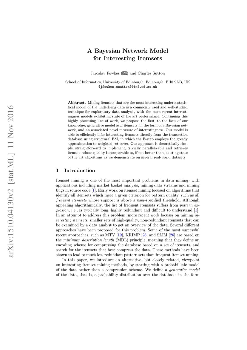 Mining itemsets that are the most interesting under a statistical model of the underlying data is a commonly used and well-studied technique for exploratory data analysis, with the most recent interestingness models exhibiting state of the art performance. Continuing this highly promising line of work, we propose the first, to the best of our knowledge, generative model over itemsets, in the form of a Bayesian network, and an associated novel measure of interestingness. Our model is able to efficiently infer interesting itemsets directly from the transaction database using structural EM, in which the E-step employs the greedy approximation to weighted set cover. Our approach is theoretically simple, straightforward to implement, trivially parallelizable and retrieves itemsets whose quality is comparable to, if not better than, existing state of the art algorithms as we demonstrate on several real-world datasets.