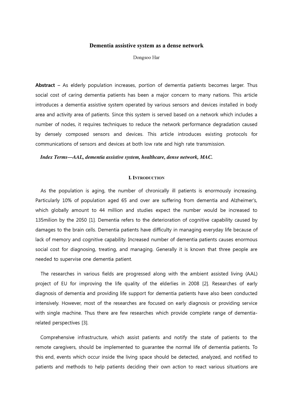 As elderly population increases, portion of dementia patients becomes larger. Thus social cost of caring dementia patients has been a major concern to many nations. This article introduces a dementia assistive system operated by various sensors and devices installed in body area and activity area of patients. Since this system is served based on a network which includes a number of nodes, it requires techniques to reduce the network performance degradation caused by densely composed sensors and devices. This article introduces existing protocols for communications of sensors and devices at both low rate and high rate transmission.