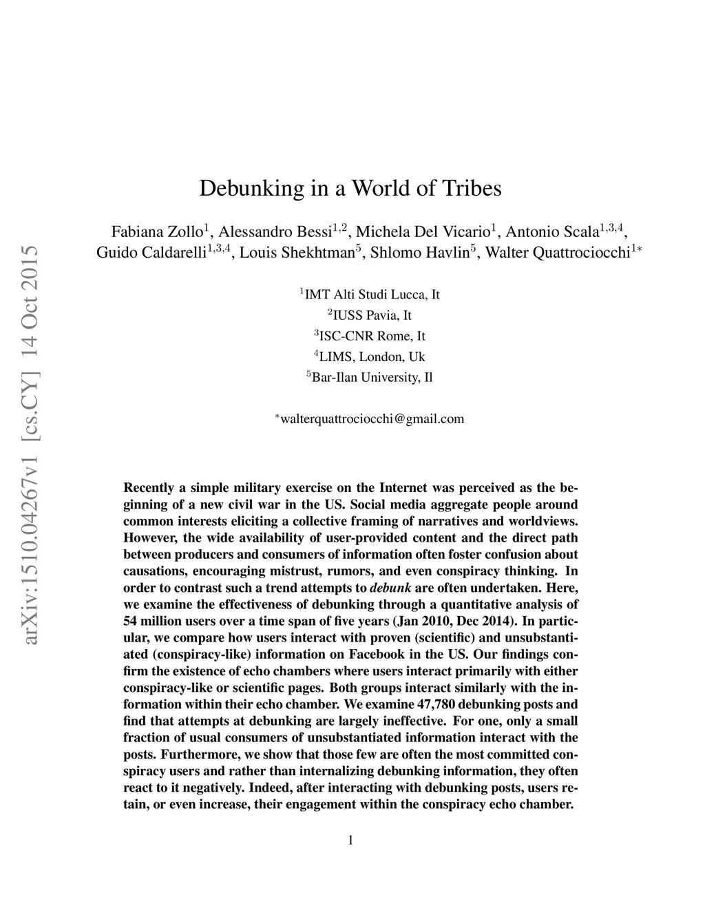 Recently a simple military exercise on the Internet was perceived as the beginning of a new civil war in the US. Social media aggregate people around common interests eliciting a collective framing of narratives and worldviews. However, the wide availability of user-provided content and the direct path between producers and consumers of information often foster confusion about causations, encouraging mistrust, rumors, and even conspiracy thinking. In order to contrast such a trend attempts to \textit{debunk} are often undertaken. Here, we examine the effectiveness of debunking through a quantitative analysis of 54 million users over a time span of five years (Jan 2010, Dec 2014). In particular, we compare how users interact with proven (scientific) and unsubstantiated (conspiracy-like) information on Facebook in the US. Our findings confirm the existence of echo chambers where users interact primarily with either conspiracy-like or scientific pages. Both groups interact similarly with the information within their echo chamber. We examine 47,780 debunking posts and find that attempts at debunking are largely ineffective. For one, only a small fraction of usual consumers of unsubstantiated information interact with the posts. Furthermore, we show that those few are often the most committed conspiracy users and rather than internalizing debunking information, they often react to it negatively. Indeed, after interacting with debunking posts, users retain, or even increase, their engagement within the conspiracy echo chamber.