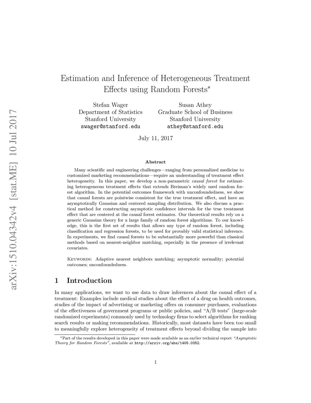 Many scientific and engineering challenges -- ranging from personalized medicine to customized marketing recommendations -- require an understanding of treatment effect heterogeneity. In this paper, we develop a non-parametric causal forest for estimating heterogeneous treatment effects that extends Breiman's widely used random forest algorithm. In the potential outcomes framework with unconfoundedness, we show that causal forests are pointwise consistent for the true treatment effect, and have an asymptotically Gaussian and centered sampling distribution. We also discuss a practical method for constructing asymptotic confidence intervals for the true treatment effect that are centered at the causal forest estimates. Our theoretical results rely on a generic Gaussian theory for a large family of random forest algorithms. To our knowledge, this is the first set of results that allows any type of random forest, including classification and regression forests, to be used for provably valid statistical inference. In experiments, we find causal forests to be substantially more powerful than classical methods based on nearest-neighbor matching, especially in the presence of irrelevant covariates.