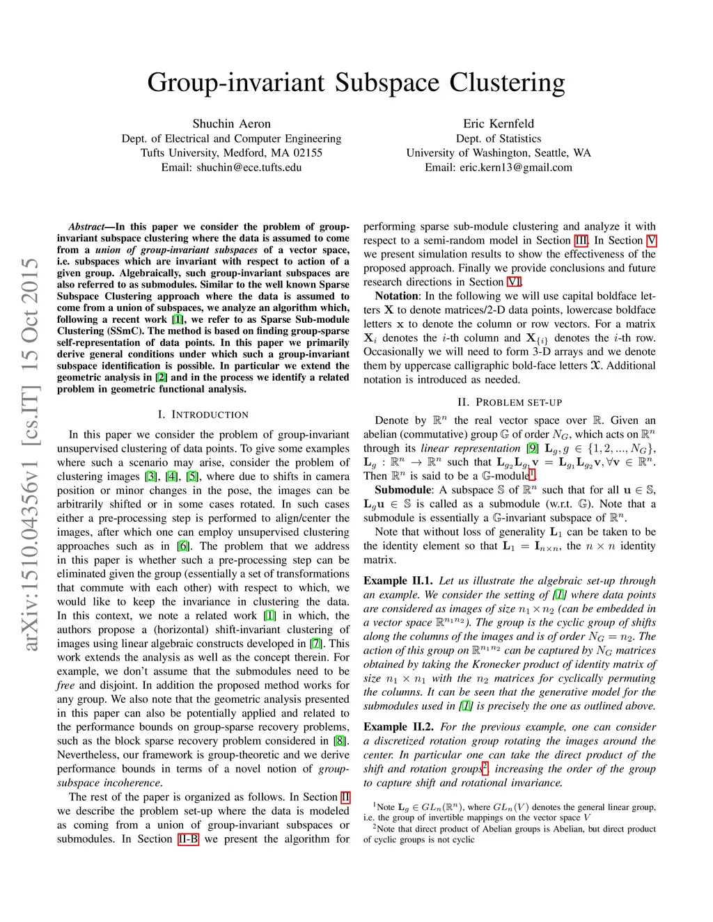 In this paper we consider the problem of group invariant subspace clustering where the data is assumed to come from a union of group-invariant subspaces of a vector space, i.e. subspaces which are invariant with respect to action of a given group. Algebraically, such group-invariant subspaces are also referred to as submodules. Similar to the well known Sparse Subspace Clustering approach where the data is assumed to come from a union of subspaces, we analyze an algorithm which, following a recent work [1], we refer to as Sparse Sub-module Clustering (SSmC). The method is based on finding group-sparse self-representation of data points. In this paper we primarily derive general conditions under which such a group-invariant subspace identification is possible. In particular we extend the geometric analysis in [2] and in the process we identify a related problem in geometric functional analysis.