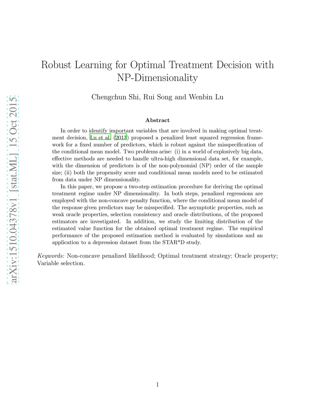 In order to identify important variables that are involved in making optimal treatment decision, Lu et al. (2013) proposed a penalized least squared regression framework for a fixed number of predictors, which is robust against the misspecification of the conditional mean model. Two problems arise: (i) in a world of explosively big data, effective methods are needed to handle ultra-high dimensional data set, for example, with the dimension of predictors is of the non-polynomial (NP) order of the sample size; (ii) both the propensity score and conditional mean models need to be estimated from data under NP dimensionality. In this paper, we propose a two-step estimation procedure for deriving the optimal treatment regime under NP dimensionality. In both steps, penalized regressions are employed with the non-concave penalty function, where the conditional mean model of the response given predictors may be misspecified. The asymptotic properties, such as weak oracle properties, selection consistency and oracle distributions, of the proposed estimators are investigated. In addition, we study the limiting distribution of the estimated value function for the obtained optimal treatment regime. The empirical performance of the proposed estimation method is evaluated by simulations and an application to a depression dataset from the STAR*D study.