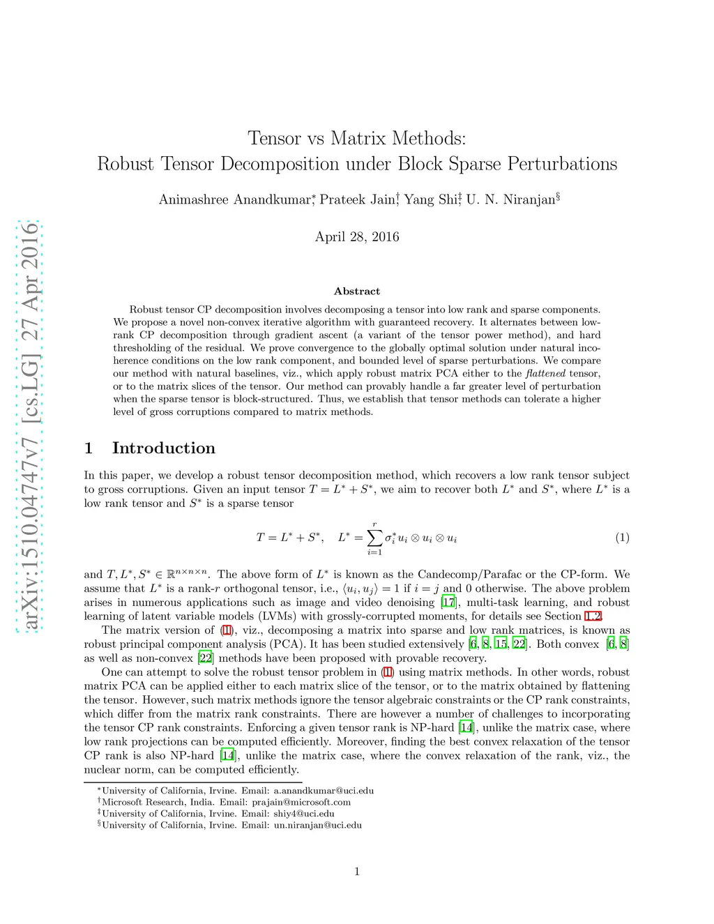 Robust tensor CP decomposition involves decomposing a tensor into low rank and sparse components. We propose a novel non-convex iterative algorithm with guaranteed recovery. It alternates between low-rank CP decomposition through gradient ascent (a variant of the tensor power method), and hard thresholding of the residual. We prove convergence to the globally optimal solution under natural incoherence conditions on the low rank component, and bounded level of sparse perturbations. We compare our method with natural baselines which apply robust matrix PCA either to the {\em flattened} tensor, or to the matrix slices of the tensor. Our method can provably handle a far greater level of perturbation when the sparse tensor is block-structured. This naturally occurs in many applications such as the activity detection task in videos. Our experiments validate these findings. Thus, we establish that tensor methods can tolerate a higher level of gross corruptions compared to matrix methods.