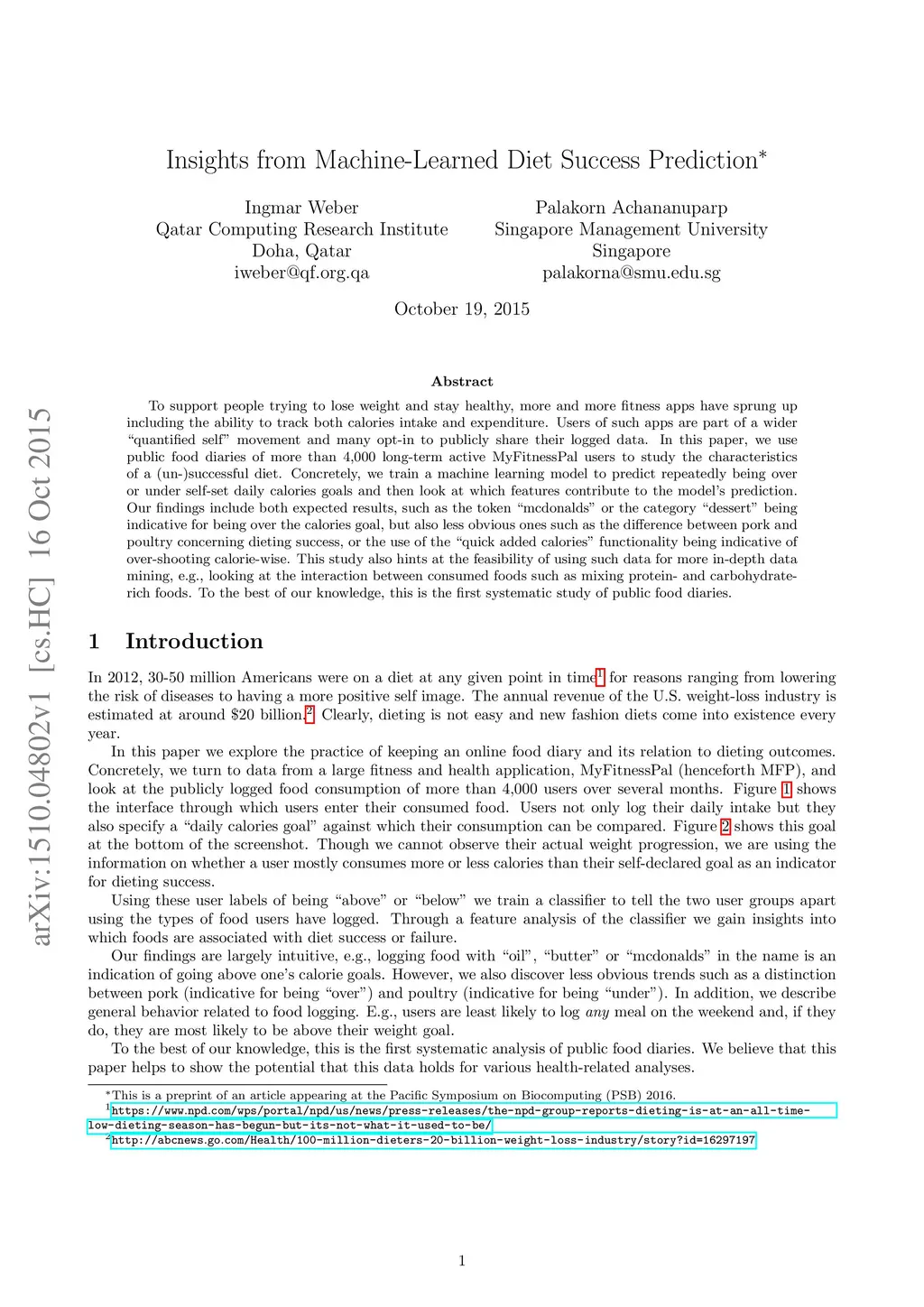 To support people trying to lose weight and stay healthy, more and more fitness apps have sprung up including the ability to track both calories intake and expenditure. Users of such apps are part of a wider ``quantified self'' movement and many opt-in to publicly share their logged data. In this paper, we use public food diaries of more than 4,000 long-term active MyFitnessPal users to study the characteristics of a (un-)successful diet. Concretely, we train a machine learning model to predict repeatedly being over or under self-set daily calories goals and then look at which features contribute to the model's prediction. Our findings include both expected results, such as the token ``mcdonalds'' or the category ``dessert'' being indicative for being over the calories goal, but also less obvious ones such as the difference between pork and poultry concerning dieting success, or the use of the ``quick added calories'' functionality being indicative of over-shooting calorie-wise. This study also hints at the feasibility of using such data for more in-depth data mining, e.g., looking at the interaction between consumed foods such as mixing protein- and carbohydrate-rich foods. To the best of our knowledge, this is the first systematic study of public food diaries.