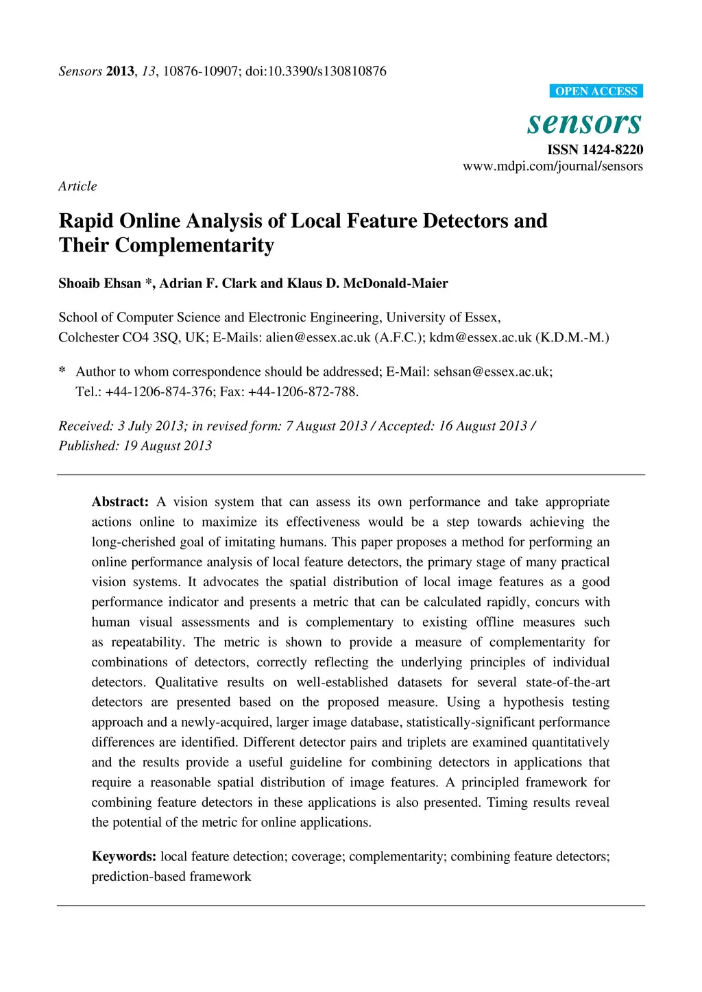 A vision system that can assess its own performance and take appropriate actions online to maximize its effectiveness would be a step towards achieving the long-cherished goal of imitating humans. This paper proposes a method for performing an online performance analysis of local feature detectors, the primary stage of many practical vision systems. It advocates the spatial distribution of local image features as a good performance indicator and presents a metric that can be calculated rapidly, concurs with human visual assessments and is complementary to existing offline measures such as repeatability. The metric is shown to provide a measure of complementarity for combinations of detectors, correctly reflecting the underlying principles of individual detectors. Qualitative results on well-established datasets for several state-of-the-art detectors are presented based on the proposed measure. Using a hypothesis testing approach and a newly-acquired, larger image database, statistically-significant performance differences are identified. Different detector pairs and triplets are examined quantitatively and the results provide a useful guideline for combining detectors in applications that require a reasonable spatial distribution of image features. A principled framework for combining feature detectors in these applications is also presented. Timing results reveal the potential of the metric for online applications.