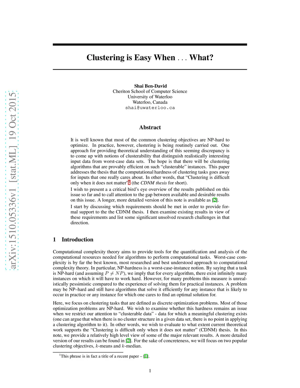 It is well known that most of the common clustering objectives are NP-hard to optimize. In practice, however, clustering is being routinely carried out. One approach for providing theoretical understanding of this seeming discrepancy is to come up with notions of clusterability that distinguish realistically interesting input data from worst-case data sets. The hope is that there will be clustering algorithms that are provably efficient on such "clusterable" instances. This paper addresses the thesis that the computational hardness of clustering tasks goes away for inputs that one really cares about. In other words, that "Clustering is difficult only when it does not matter" (the \emph{CDNM thesis} for short). I wish to present a a critical bird's eye overview of the results published on this issue so far and to call attention to the gap between available and desirable results on this issue. A longer, more detailed version of this note is available as arXiv:1507.05307. I discuss which requirements should be met in order to provide formal support to the the CDNM thesis and then examine existing results in view of these requirements and list some significant unsolved research challenges in that direction.