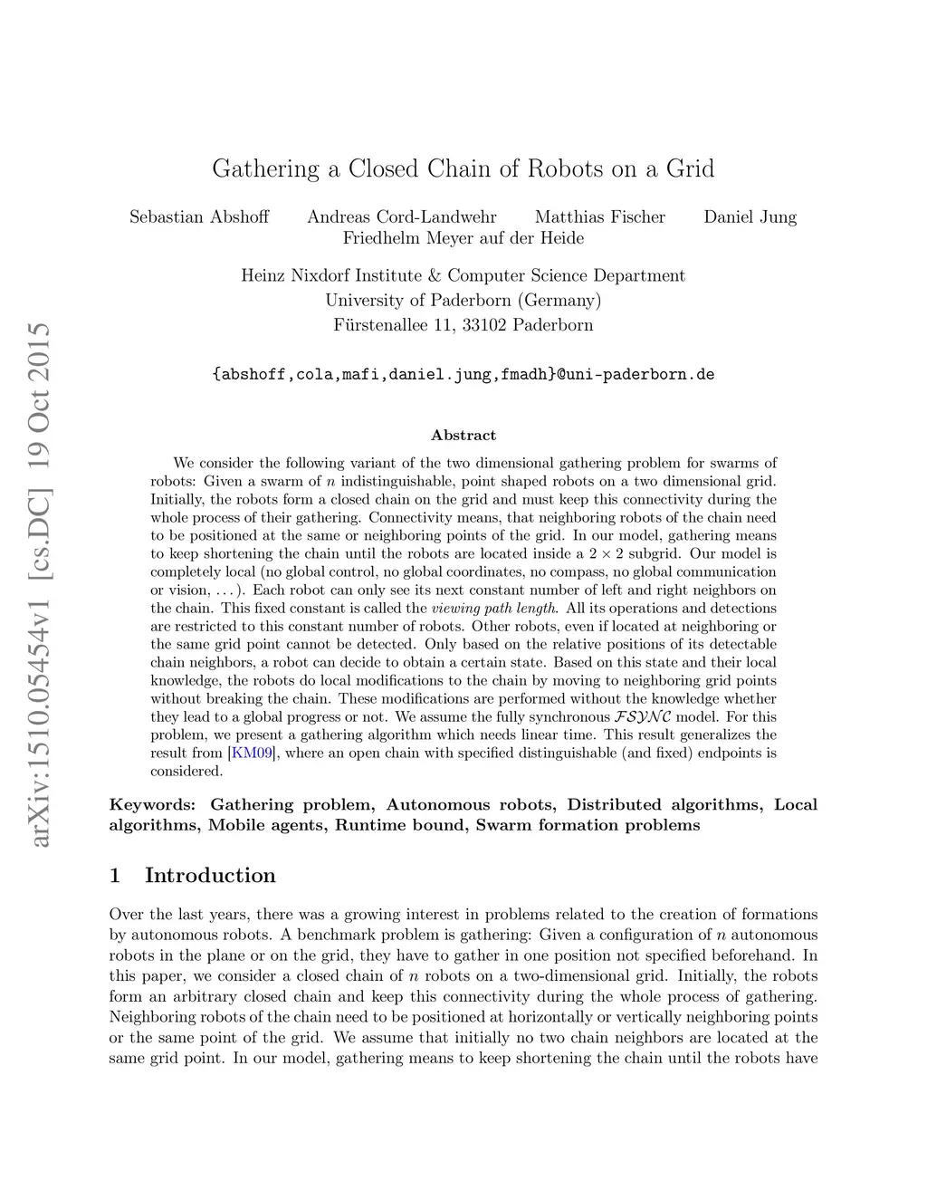 We consider the following variant of the two dimensional gathering problem for swarms of robots: Given a swarm of indistinguishable, point shaped robots on a two dimensional grid. Initially, the robots form a closed chain on the grid and must keep this connectivity during the whole process of their gathering. Connectivity means, that neighboring robots of the chain need to be positioned at the same or neighboring points of the grid. In our model, gathering means to keep shortening the chain until the robots are located inside a subgrid. Our model is completely local (no global control, no global coordinates, no compass, no global communication or vision, \ldots). Each robot can only see its next constant number of left and right neighbors on the chain. This fixed constant is called the \emph{viewing path length}. All its operations and detections are restricted to this constant number of robots. Other robots, even if located at neighboring or the same grid point cannot be detected. Only based on the relative positions of its detectable chain neighbors, a robot can decide to obtain a certain state. Based on this state and their local knowledge, the robots do local modifications to the chain by moving to neighboring grid points without breaking the chain. These modifications are performed without the knowledge whether they lead to a global progress or not. We assume the fully synchronous model. For this problem, we present a gathering algorithm which needs linear time. This result generalizes the result from \cite{hopper}, where an open chain with specified distinguishable (and fixed) endpoints is considered.