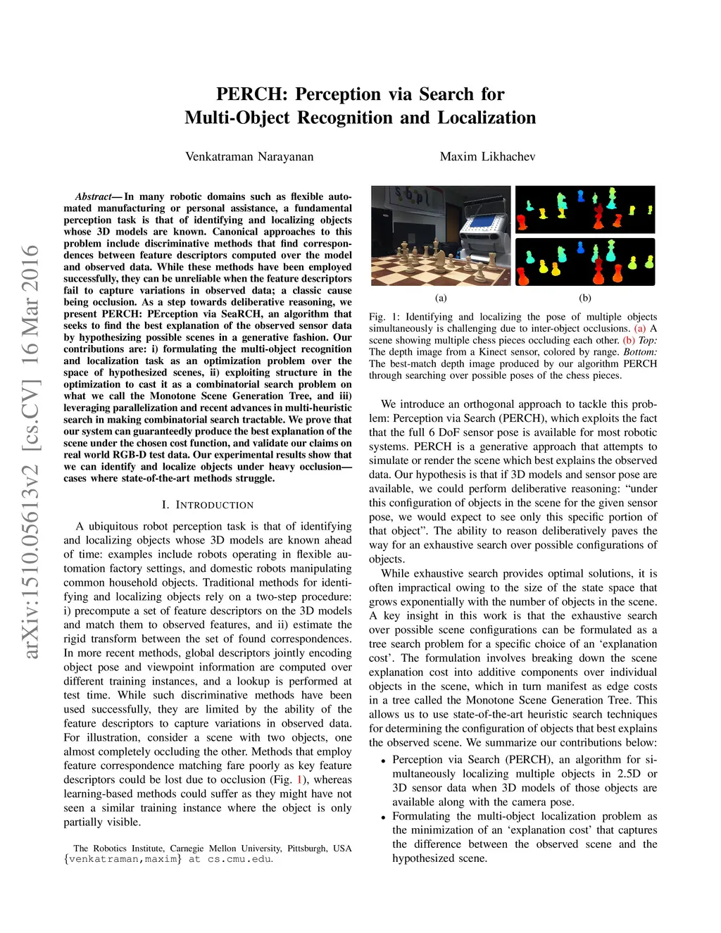In many robotic domains such as flexible automated manufacturing or personal assistance, a fundamental perception task is that of identifying and localizing objects whose 3D models are known. Canonical approaches to this problem include discriminative methods that find correspondences between feature descriptors computed over the model and observed data. While these methods have been employed successfully, they can be unreliable when the feature descriptors fail to capture variations in observed data; a classic cause being occlusion. As a step towards deliberative reasoning, we present PERCH: PErception via SeaRCH, an algorithm that seeks to find the best explanation of the observed sensor data by hypothesizing possible scenes in a generative fashion. Our contributions are: i) formulating the multi-object recognition and localization task as an optimization problem over the space of hypothesized scenes, ii) exploiting structure in the optimization to cast it as a combinatorial search problem on what we call the Monotone Scene Generation Tree, and iii) leveraging parallelization and recent advances in multi-heuristic search in making combinatorial search tractable. We prove that our system can guaranteedly produce the best explanation of the scene under the chosen cost function, and validate our claims on real world RGB-D test data. Our experimental results show that we can identify and localize objects under heavy occlusion--cases where state-of-the-art methods struggle.