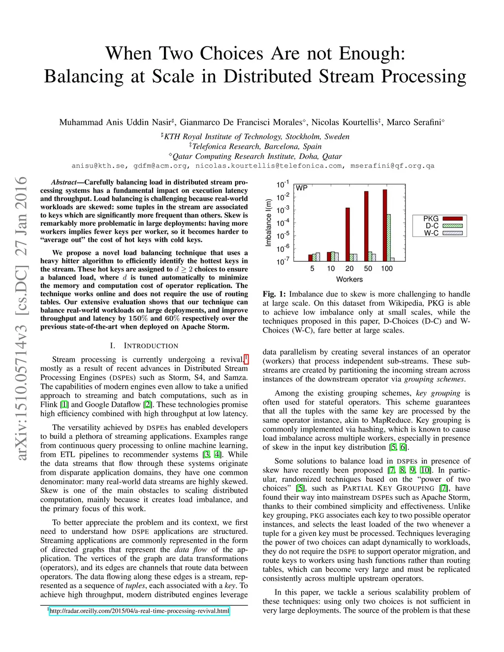 Carefully balancing load in distributed stream processing systems has a fundamental impact on execution latency and throughput. Load balancing is challenging because real-world workloads are skewed: some tuples in the stream are associated to keys which are significantly more frequent than others. Skew is remarkably more problematic in large deployments: more workers implies fewer keys per worker, so it becomes harder to "average out" the cost of hot keys with cold keys. We propose a novel load balancing technique that uses a heaving hitter algorithm to efficiently identify the hottest keys in the stream. These hot keys are assigned to choices to ensure a balanced load, where is tuned automatically to minimize the memory and computation cost of operator replication. The technique works online and does not require the use of routing tables. Our extensive evaluation shows that our technique can balance real-world workloads on large deployments, and improve throughput and latency by and respectively over the previous state-of-the-art when deployed on Apache Storm.
