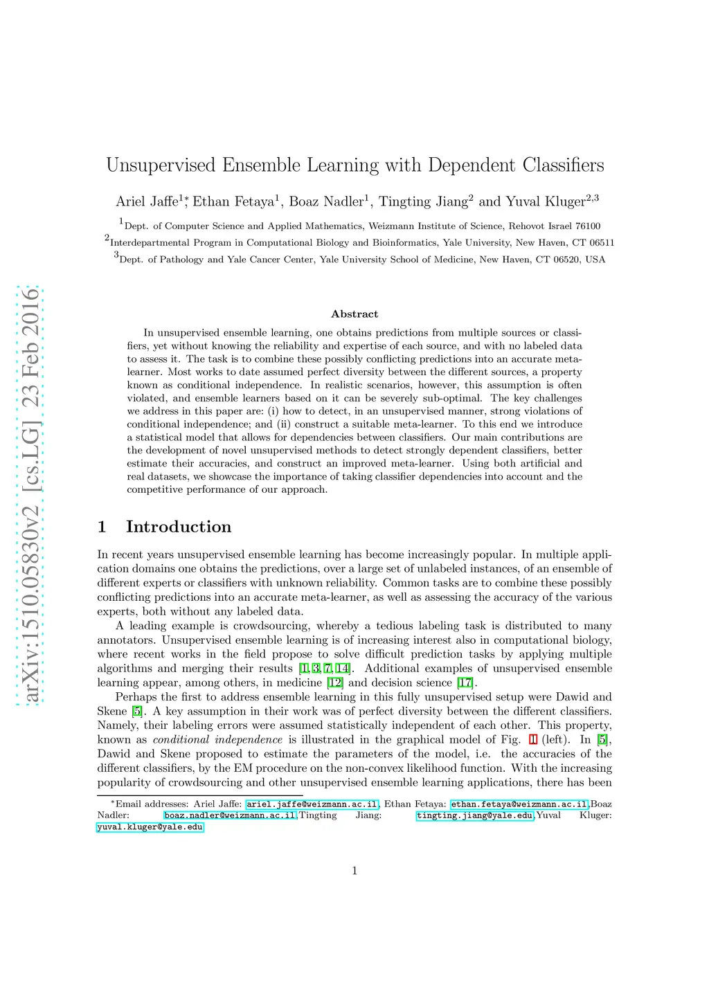 Unsupervised Ensemble Learning with Dependent Classifiers