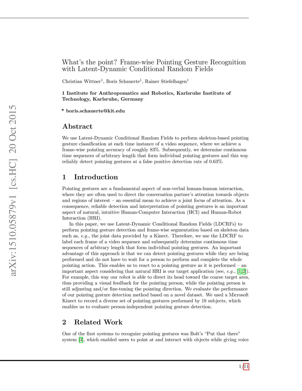 We use Latent-Dynamic Conditional Random Fields to perform skeleton-based pointing gesture classification at each time instance of a video sequence, where we achieve a frame-wise pointing accuracy of roughly 83%. Subsequently, we determine continuous time sequences of arbitrary length that form individual pointing gestures and this way reliably detect pointing gestures at a false positive detection rate of 0.63%.