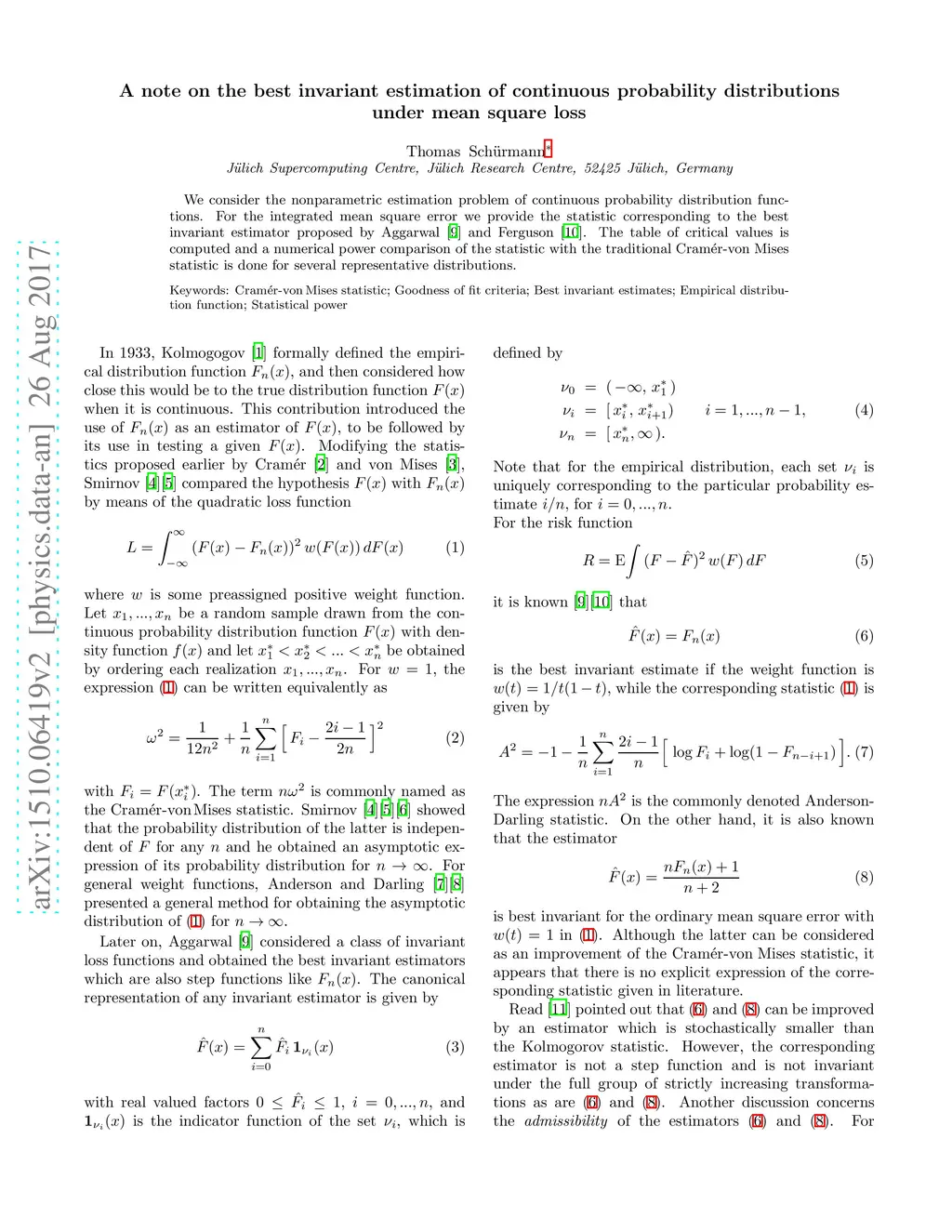We consider the nonparametric estimation problem of continuous probability distribution functions. For the integrated mean square error we provide the statistic corresponding to the best invariant estimator proposed by Aggarwal (1955) and Ferguson (1967). The table of critical values is computed and a numerical power comparison of the statistic with the traditional Cram\'{e}r-von Mises statistic is done for several representative distributions.