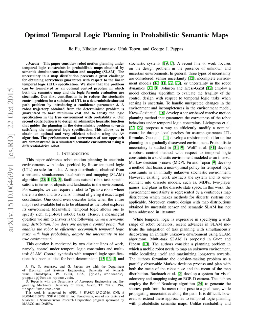 This paper considers robot motion planning under temporal logic constraints in probabilistic maps obtained by semantic simultaneous localization and mapping (SLAM). The uncertainty in a map distribution presents a great challenge for obtaining correctness guarantees with respect to the linear temporal logic (LTL) specification. We show that the problem can be formulated as an optimal control problem in which both the semantic map and the logic formula evaluation are stochastic. Our first contribution is to reduce the stochastic control problem for a subclass of LTL to a deterministic shortest path problem by introducing a confidence parameter . A robot trajectory obtained from the deterministic problem is guaranteed to have minimum cost and to satisfy the logic specification in the true environment with probability . Our second contribution is to design an admissible heuristic function that guides the planning in the deterministic problem towards satisfying the temporal logic specification. This allows us to obtain an optimal and very efficient solution using the A* algorithm. The performance and correctness of our approach are demonstrated in a simulated semantic environment using a differential-drive robot.