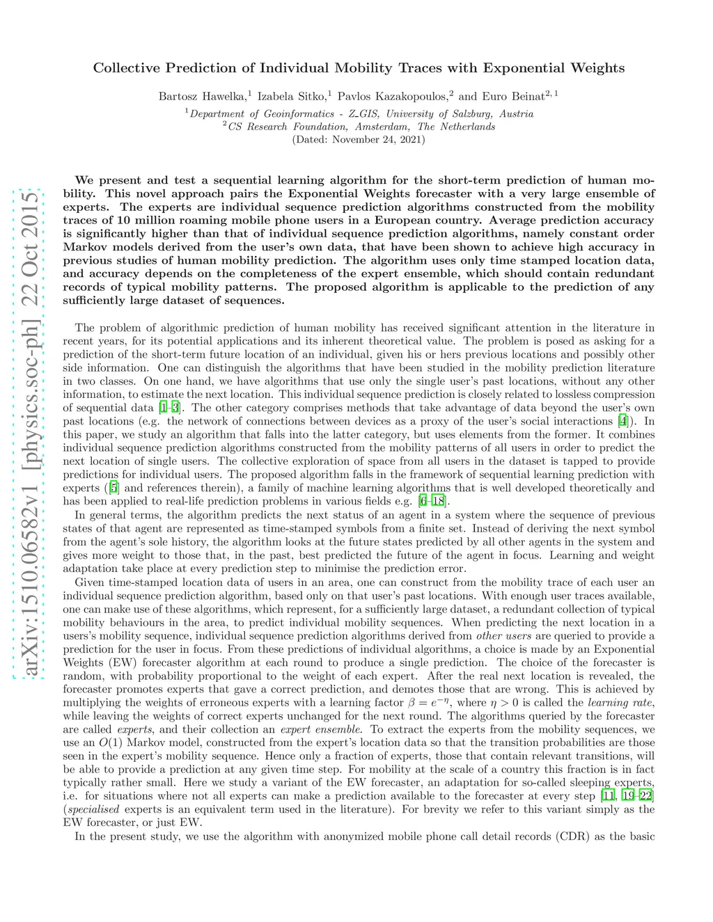 We present and test a sequential learning algorithm for the short-term prediction of human mobility. This novel approach pairs the Exponential Weights forecaster with a very large ensemble of experts. The experts are individual sequence prediction algorithms constructed from the mobility traces of 10 million roaming mobile phone users in a European country. Average prediction accuracy is significantly higher than that of individual sequence prediction algorithms, namely constant order Markov models derived from the user's own data, that have been shown to achieve high accuracy in previous studies of human mobility prediction. The algorithm uses only time stamped location data, and accuracy depends on the completeness of the expert ensemble, which should contain redundant records of typical mobility patterns. The proposed algorithm is applicable to the prediction of any sufficiently large dataset of sequences.
