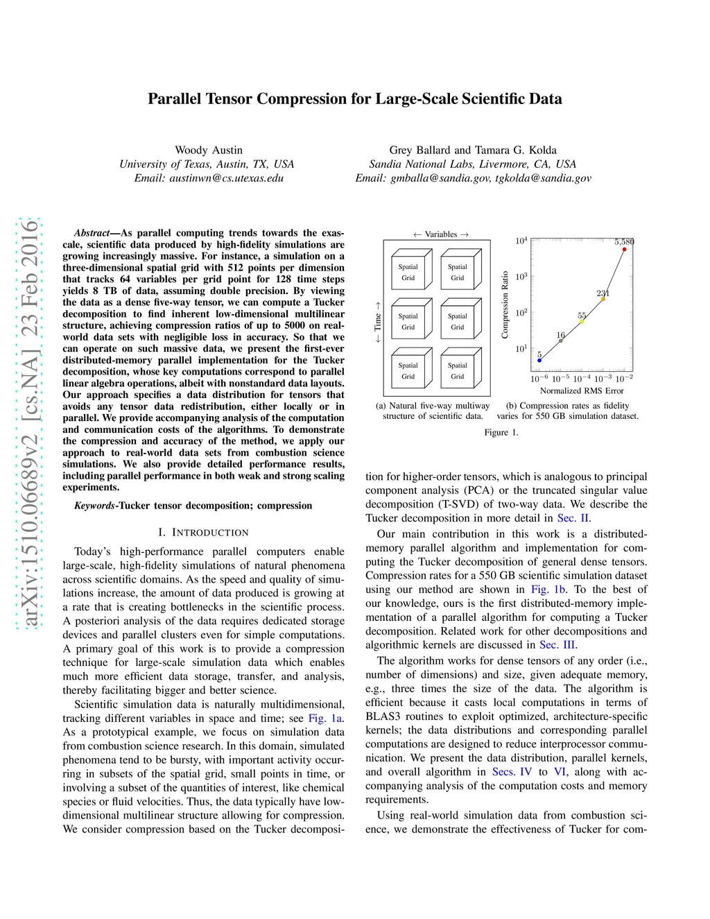 As parallel computing trends towards the exascale, scientific data produced by high-fidelity simulations are growing increasingly massive. For instance, a simulation on a three-dimensional spatial grid with 512 points per dimension that tracks 64 variables per grid point for 128 time steps yields 8~TB of data, assuming double precision. By viewing the data as a dense five-way tensor, we can compute a Tucker decomposition to find inherent low-dimensional multilinear structure, achieving compression ratios of up to 5000 on real-world data sets with negligible loss in accuracy. So that we can operate on such massive data, we present the first-ever distributed-memory parallel implementation for the Tucker decomposition, whose key computations correspond to parallel linear algebra operations, albeit with nonstandard data layouts. Our approach specifies a data distribution for tensors that avoids any tensor data redistribution, either locally or in parallel. We provide accompanying analysis of the computation and communication costs of the algorithms. To demonstrate the compression and accuracy of the method, we apply our approach to real-world data sets from combustion science simulations. We also provide detailed performance results, including parallel performance in both weak and strong scaling experiments.