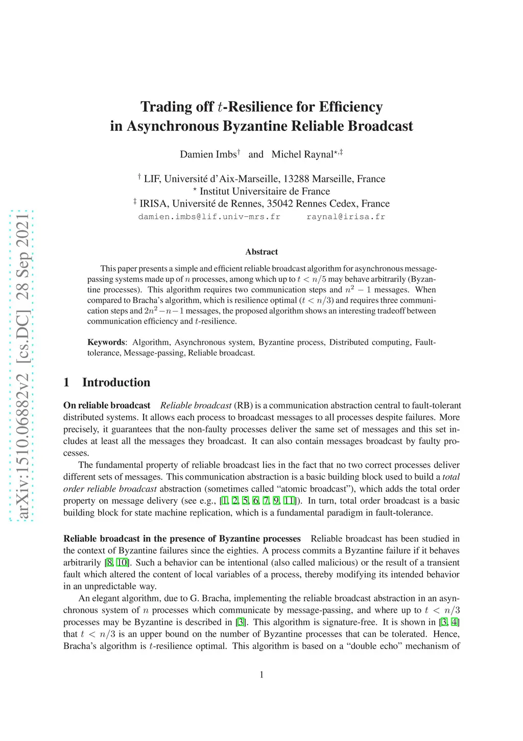 This paper presents a simple and efficient reliable broadcast algorithm for asynchronous message-passing systems made up of processes, among which up to may behave arbitrarily (Byzantine processes). This algorithm requires two communication steps and messages. When compared to Bracha's algorithm, which is resilience optimal () and requires three communication steps and messages, the proposed algorithm shows an interesting tradeoff between communication efficiency and -resilience.
