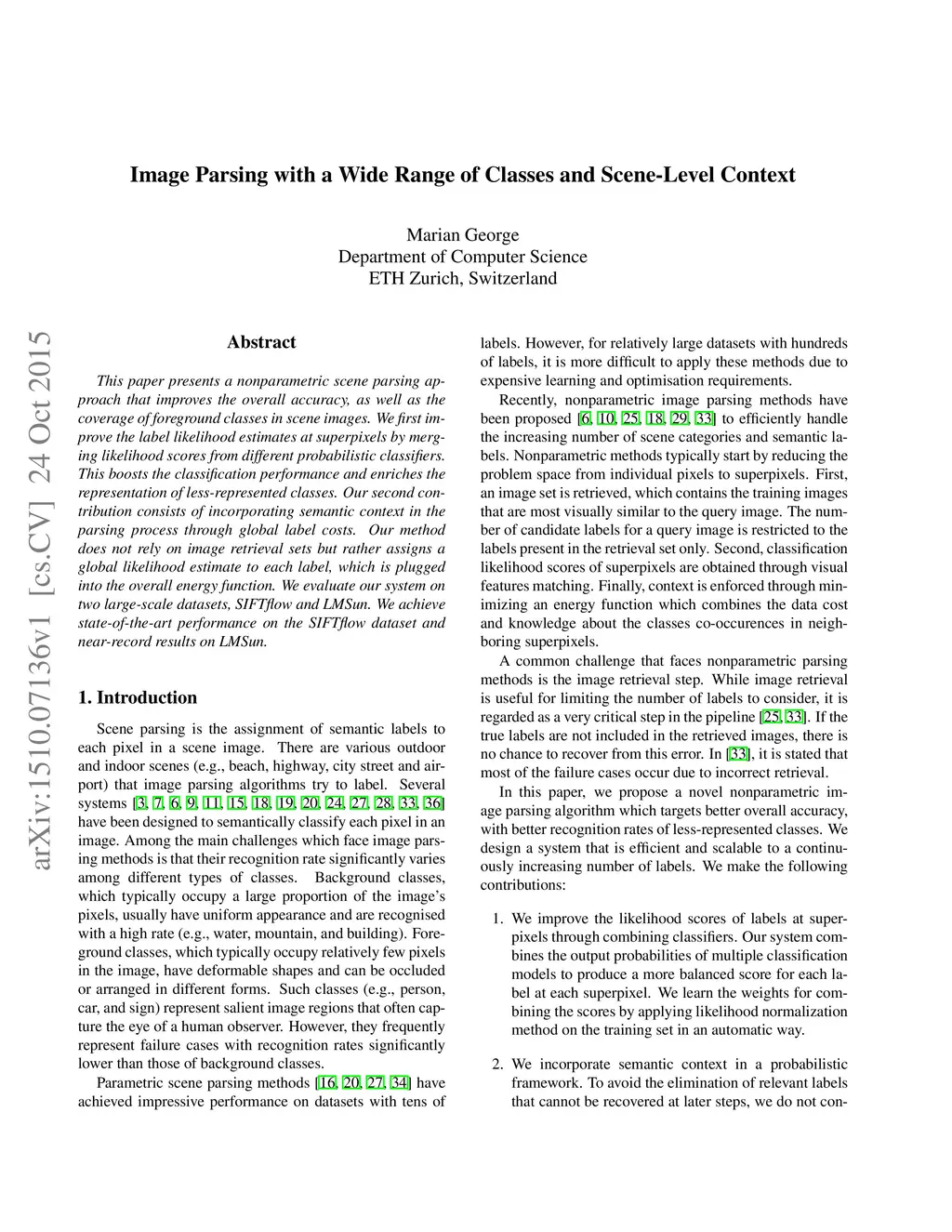 This paper presents a nonparametric scene parsing approach that improves the overall accuracy, as well as the coverage of foreground classes in scene images. We first improve the label likelihood estimates at superpixels by merging likelihood scores from different probabilistic classifiers. This boosts the classification performance and enriches the representation of less-represented classes. Our second contribution consists of incorporating semantic context in the parsing process through global label costs. Our method does not rely on image retrieval sets but rather assigns a global likelihood estimate to each label, which is plugged into the overall energy function. We evaluate our system on two large-scale datasets, SIFTflow and LMSun. We achieve state-of-the-art performance on the SIFTflow dataset and near-record results on LMSun.