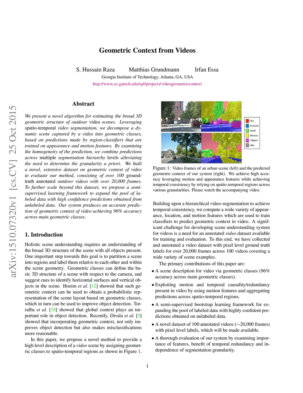 We present a novel algorithm for estimating the broad 3D geometric structure of outdoor video scenes. Leveraging spatio-temporal video segmentation, we decompose a dynamic scene captured by a video into geometric classes, based on predictions made by region-classifiers that are trained on appearance and motion features. By examining the homogeneity of the prediction, we combine predictions across multiple segmentation hierarchy levels alleviating the need to determine the granularity a priori. We built a novel, extensive dataset on geometric context of video to evaluate our method, consisting of over 100 ground-truth annotated outdoor videos with over 20,000 frames. To further scale beyond this dataset, we propose a semi-supervised learning framework to expand the pool of labeled data with high confidence predictions obtained from unlabeled data. Our system produces an accurate prediction of geometric context of video achieving 96% accuracy across main geometric classes.