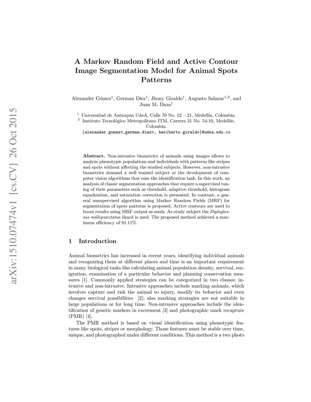 Non-intrusive biometrics of animals using images allows to analyze phenotypic populations and individuals with patterns like stripes and spots without affecting the studied subjects. However, non-intrusive biometrics demand a well trained subject or the development of computer vision algorithms that ease the identification task. In this work, an analysis of classic segmentation approaches that require a supervised tuning of their parameters such as threshold, adaptive threshold, histogram equalization, and saturation correction is presented. In contrast, a general unsupervised algorithm using Markov Random Fields (MRF) for segmentation of spots patterns is proposed. Active contours are used to boost results using MRF output as seeds. As study subject the Diploglossus millepunctatus lizard is used. The proposed method achieved a maximum efficiency of .