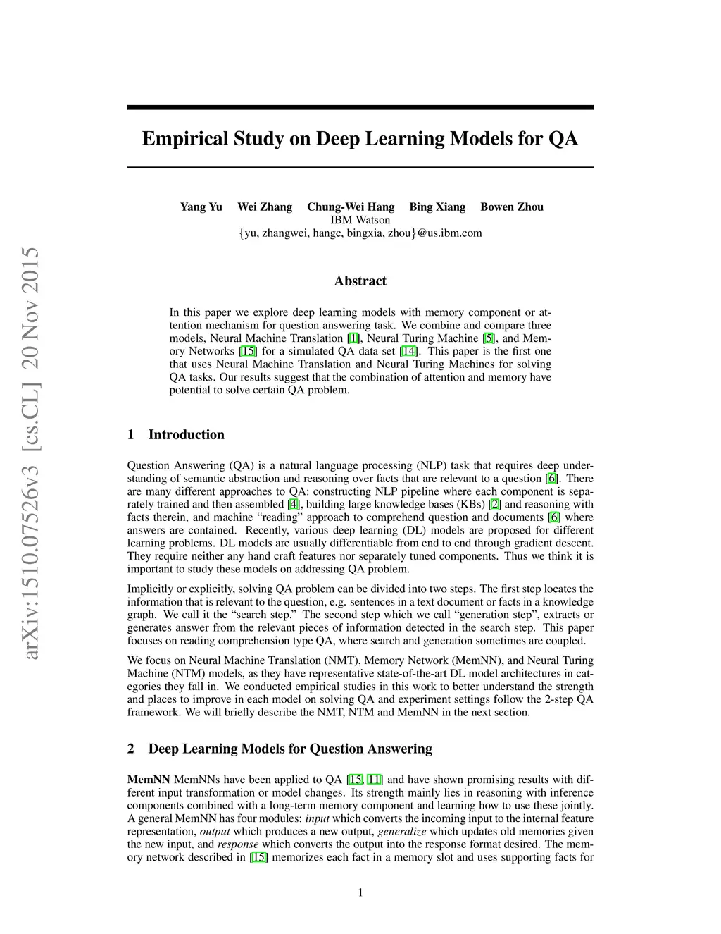 In this paper we explore deep learning models with memory component or attention mechanism for question answering task. We combine and compare three models, Neural Machine Translation, Neural Turing Machine, and Memory Networks for a simulated QA data set. This paper is the first one that uses Neural Machine Translation and Neural Turing Machines for solving QA tasks. Our results suggest that the combination of attention and memory have potential to solve certain QA problem.