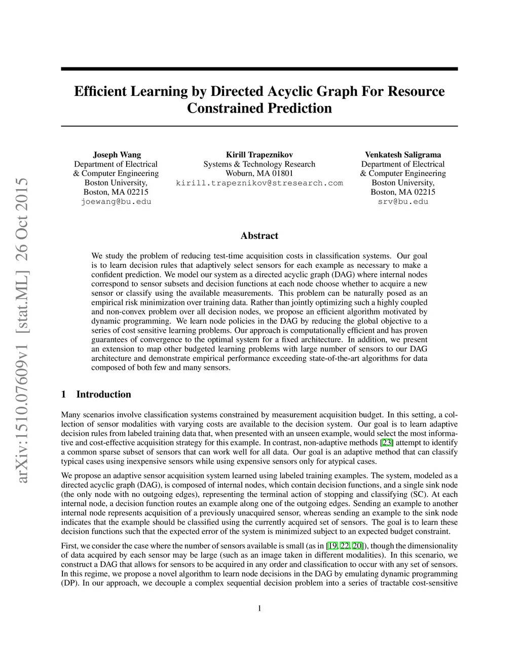 We study the problem of reducing test-time acquisition costs in classification systems. Our goal is to learn decision rules that adaptively select sensors for each example as necessary to make a confident prediction. We model our system as a directed acyclic graph (DAG) where internal nodes correspond to sensor subsets and decision functions at each node choose whether to acquire a new sensor or classify using the available measurements. This problem can be naturally posed as an empirical risk minimization over training data. Rather than jointly optimizing such a highly coupled and non-convex problem over all decision nodes, we propose an efficient algorithm motivated by dynamic programming. We learn node policies in the DAG by reducing the global objective to a series of cost sensitive learning problems. Our approach is computationally efficient and has proven guarantees of convergence to the optimal system for a fixed architecture. In addition, we present an extension to map other budgeted learning problems with large number of sensors to our DAG architecture and demonstrate empirical performance exceeding state-of-the-art algorithms for data composed of both few and many sensors.