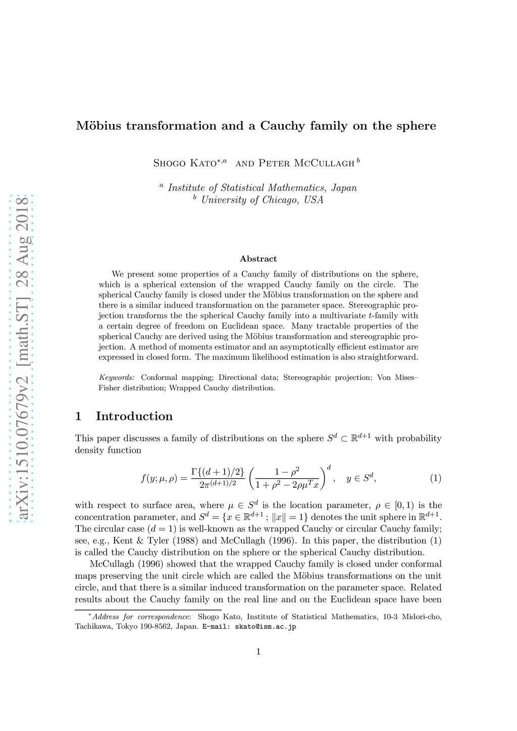 We present some properties of a Cauchy family of distributions on the sphere, which is a spherical extension of the wrapped Cauchy family on the circle. The spherical Cauchy family is closed under the M\"obius transformation on the sphere and there is a similar induced transformation on the parameter space. Stereographic projection transforms the the spherical Cauchy family into a multivariate -family with a certain degree of freedom on Euclidean space. Many tractable properties of the spherical Cauchy are derived using the M\"obius transformation and stereographic projection. A method of moments estimator and an asymptotically efficient estimator are expressed in closed form. The maximum likelihood estimation is also straightforward.