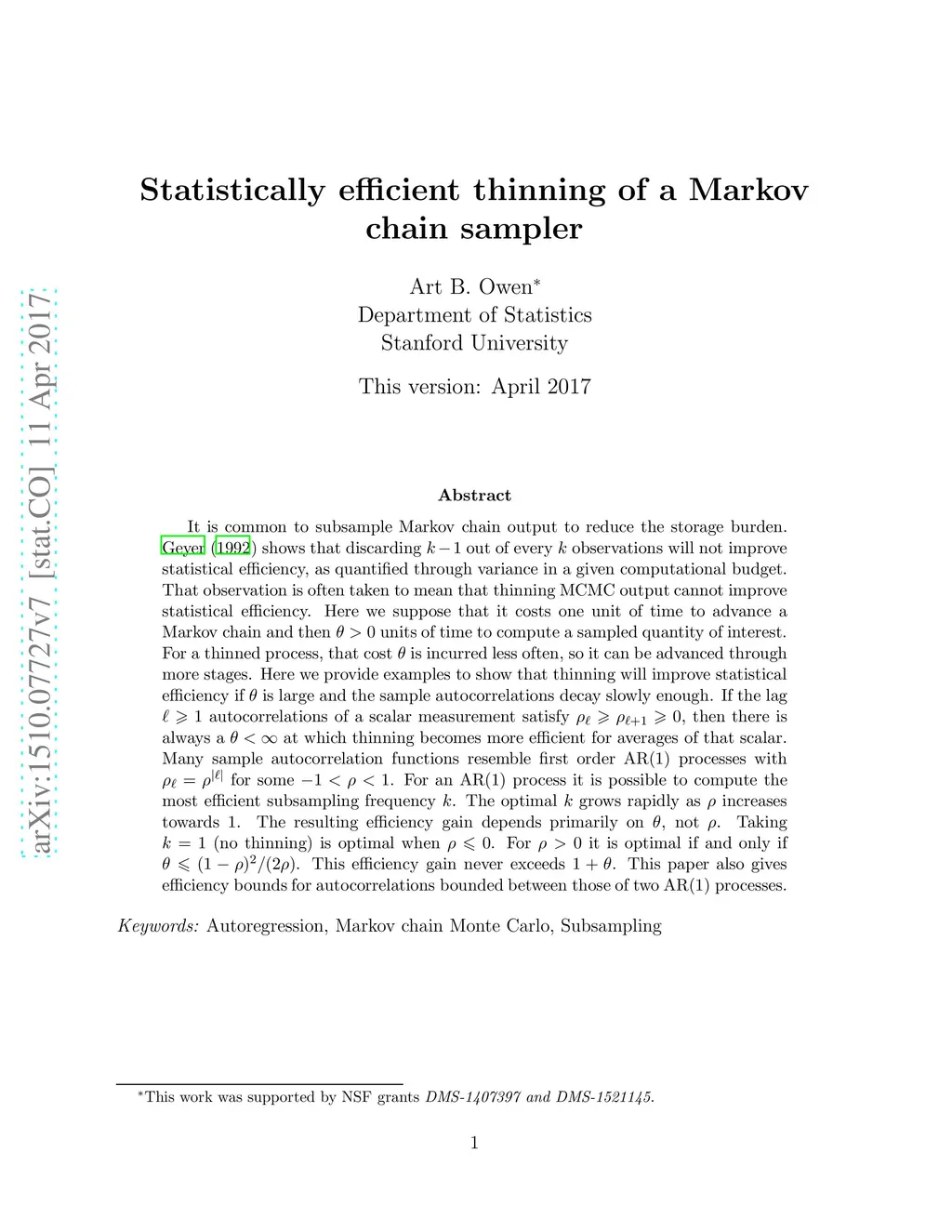 It is common to subsample Markov chain output to reduce the storage burden. Geyer (1992) shows that discarding k1k-1 out of every kk observations will not improve statistical efficiency, as quantified through variance in a given computational budget. That observation is often taken to mean that thinning MCMC output cannot improve statistical efficiency. Here we suppose that it costs one unit of time to advance a Markov chain and then θ>0\theta>0 units of time to compute a sampled quantity of interest. For a thinned process, that cost θ\theta is incurred less often, so it can be advanced through more stages. Here we provide examples to show that thinning will improve statistical efficiency if θ\theta is large and the sample autocorrelations decay slowly enough. If the lag 1\ell\ge1 autocorrelations of a scalar measurement satisfy ρρ+10\rho_\ell\ge\rho_{\ell+1}\ge0, then there is always a θ<\theta<\infty at which thinning becomes more efficient for averages of that scalar. Many sample autocorrelation functions resemble first order AR(1) processes with ρ=ρ\rho_\ell =\rho^{|\ell|} for some 1<ρ<1-1<\rho<1. For an AR(1) process it is possible to compute the most efficient subsampling frequency kk. The optimal kk grows rapidly as ρ\rho increases towards 11. The resulting efficiency gain depends primarily on θ\theta, not ρ\rho. Taking k=1k=1 (no thinning) is optimal when ρ0\rho\le0. For ρ>0\rho>0 it is optimal if and only if θ(1ρ)2/(2ρ)\theta \le (1-\rho)^2/(2\rho). This efficiency gain never exceeds 1+θ1+\theta. This paper also gives efficiency bounds for autocorrelations bounded between those of two AR(1) processes.