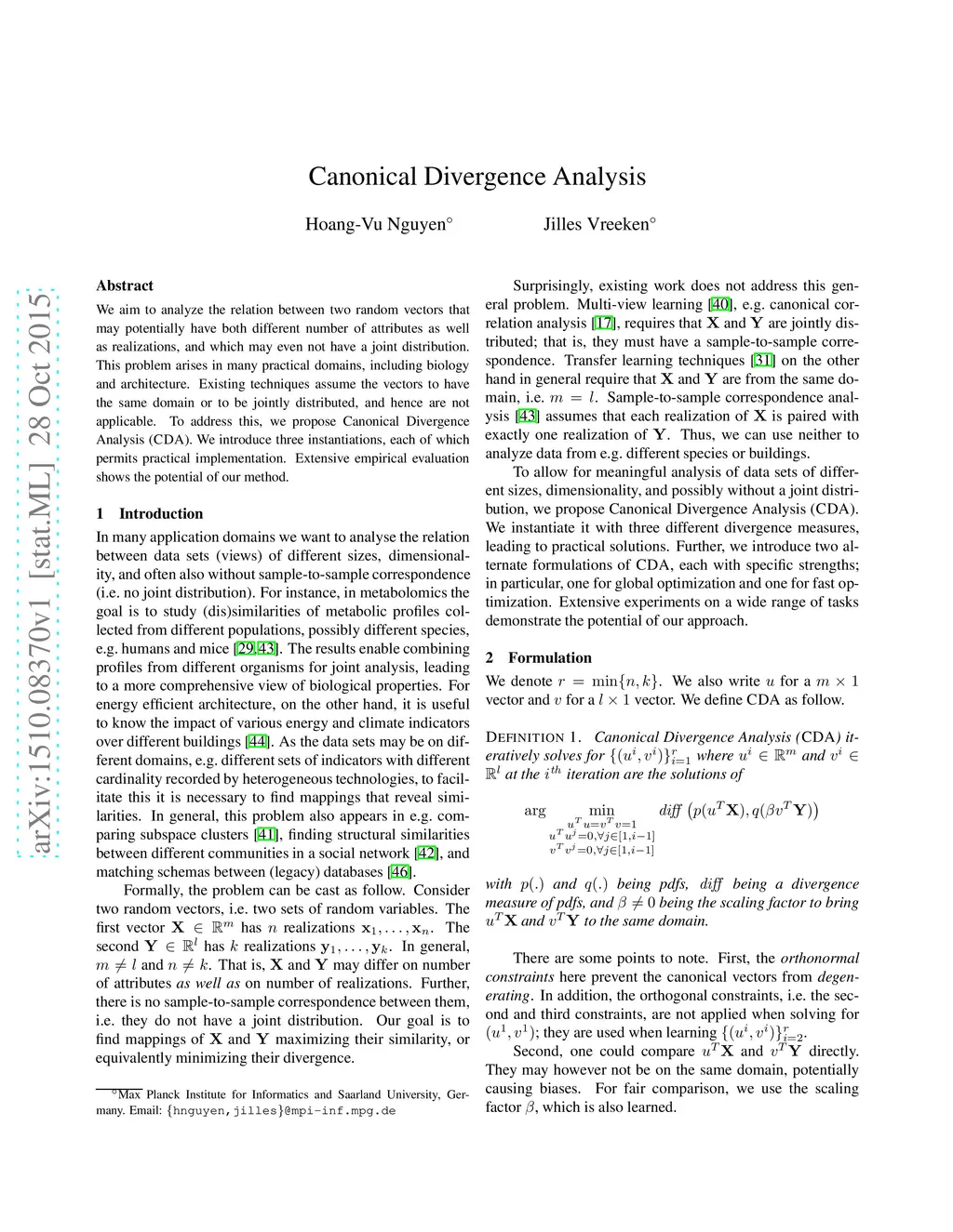 We aim to analyze the relation between two random vectors that may potentially have both different number of attributes as well as realizations, and which may even not have a joint distribution. This problem arises in many practical domains, including biology and architecture. Existing techniques assume the vectors to have the same domain or to be jointly distributed, and hence are not applicable. To address this, we propose Canonical Divergence Analysis (CDA). We introduce three instantiations, each of which permits practical implementation. Extensive empirical evaluation shows the potential of our method.