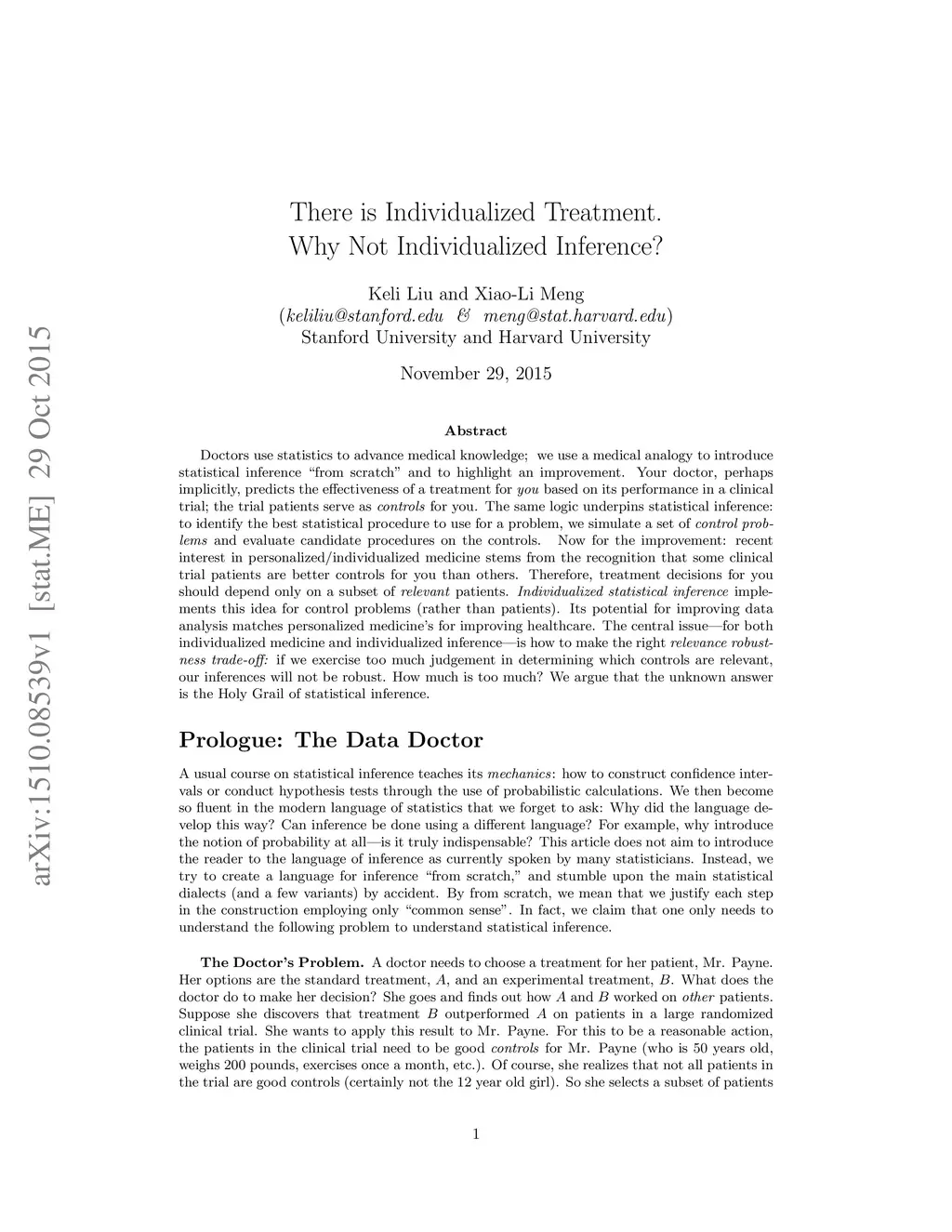 Doctors use statistics to advance medical knowledge; we use a medical analogy to introduce statistical inference "from scratch" and to highlight an improvement. Your doctor, perhaps implicitly, predicts the effectiveness of a treatment for you based on its performance in a clinical trial; the trial patients serve as controls for you. The same logic underpins statistical inference: to identify the best statistical procedure to use for a problem, we simulate a set of control problems and evaluate candidate procedures on the controls. Now for the improvement: recent interest in personalized/individualized medicine stems from the recognition that some clinical trial patients are better controls for you than others. Therefore, treatment decisions for you should depend only on a subset of relevant patients. Individualized statistical inference implements this idea for control problems (rather than patients). Its potential for improving data analysis matches personalized medicine's for improving healthcare. The central issue--for both individualized medicine and individualized inference--is how to make the right relevance robustness trade-off: if we exercise too much judgement in determining which controls are relevant, our inferences will not be robust. How much is too much? We argue that the unknown answer is the Holy Grail of statistical inference.