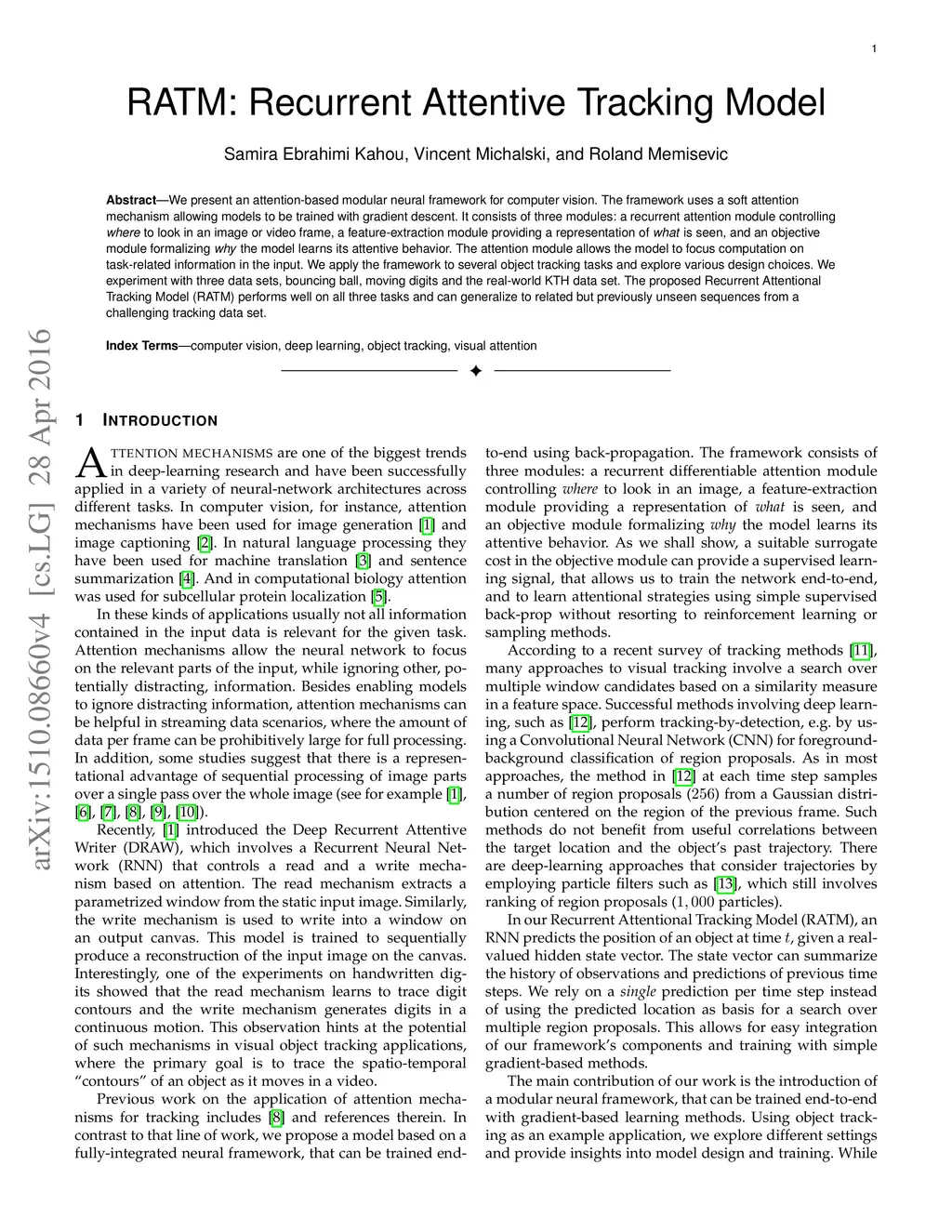 We present an attention-based modular neural framework for computer vision. The framework uses a soft attention mechanism allowing models to be trained with gradient descent. It consists of three modules: a recurrent attention module controlling where to look in an image or video frame, a feature-extraction module providing a representation of what is seen, and an objective module formalizing why the model learns its attentive behavior. The attention module allows the model to focus computation on task-related information in the input. We apply the framework to several object tracking tasks and explore various design choices. We experiment with three data sets, bouncing ball, moving digits and the real-world KTH data set. The proposed Recurrent Attentive Tracking Model performs well on all three tasks and can generalize to related but previously unseen sequences from a challenging tracking data set.