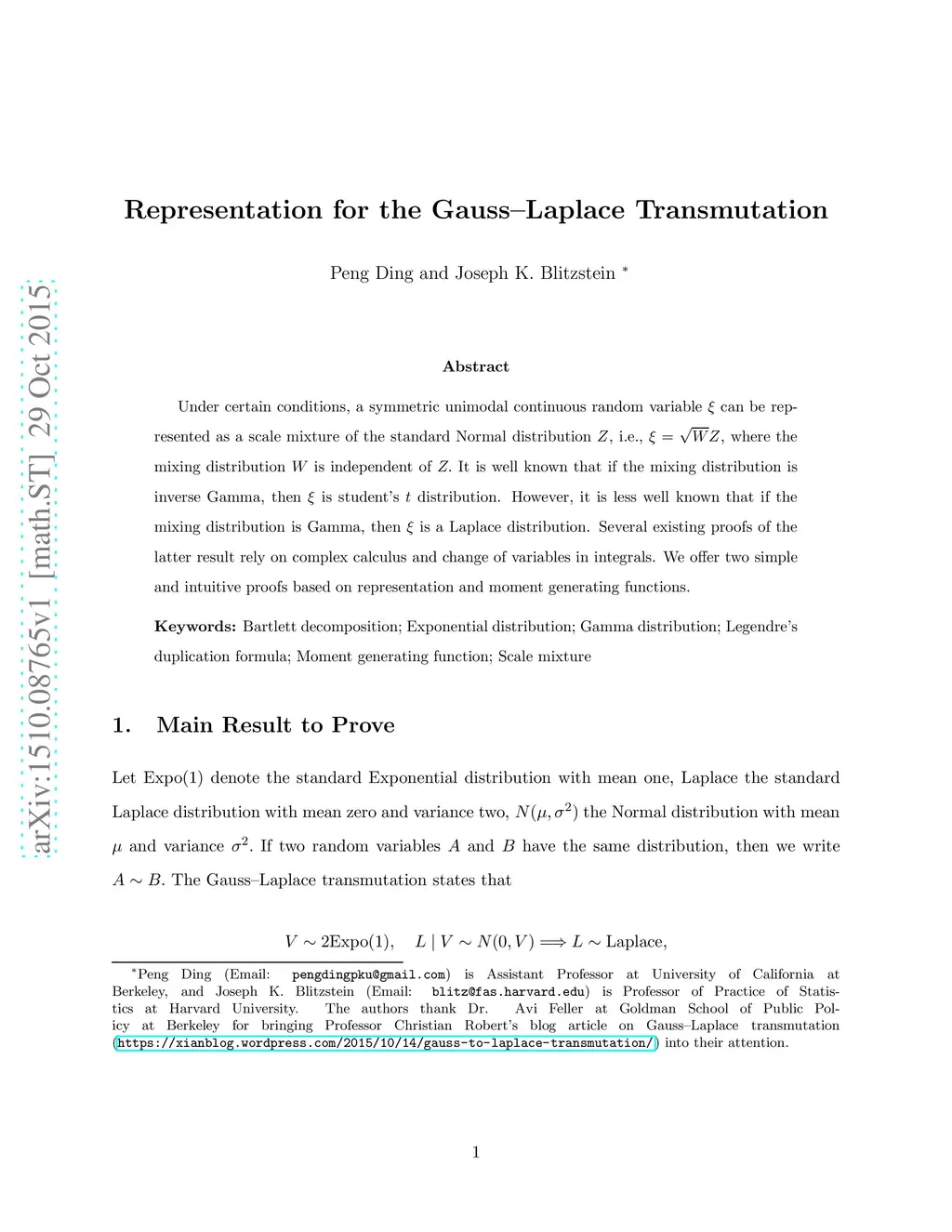Under certain conditions, a symmetric unimodal continuous random variable can be represented as a scale mixture of the standard Normal distribution , i.e., , where the mixing distribution is independent of It is well known that if the mixing distribution is inverse Gamma, then is student's distribution. However, it is less well known that if the mixing distribution is Gamma, then is a Laplace distribution. Several existing proofs of the latter result rely on complex calculus and change of variables in integrals. We offer two simple and intuitive proofs based on representation and moment generating functions.