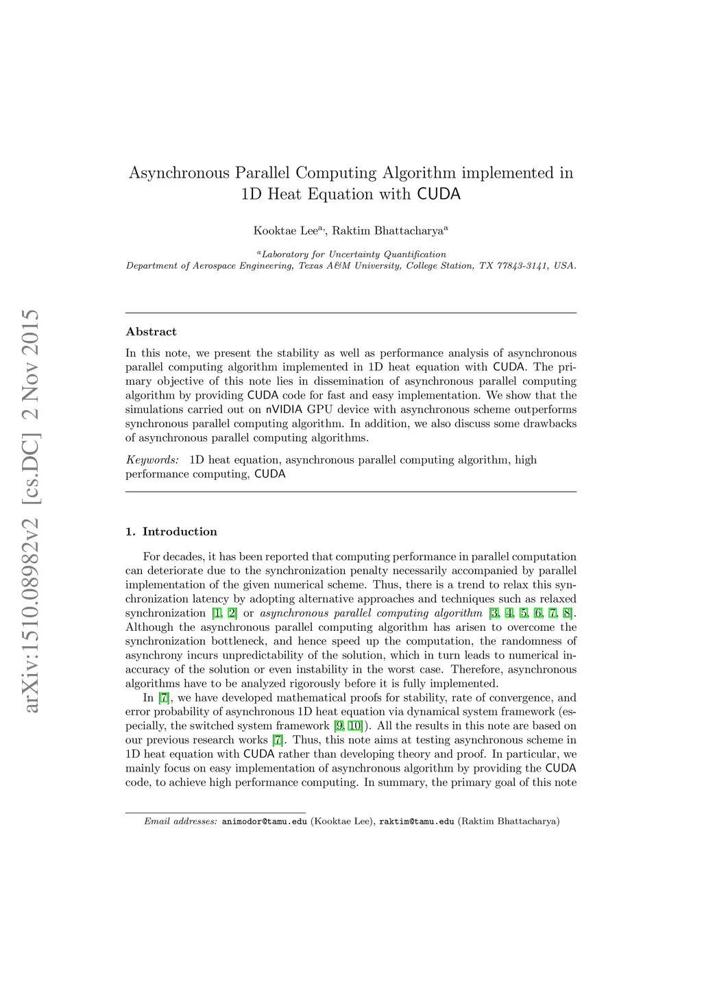 In this note, we present the stability as well as performance analysis of asynchronous parallel computing algorithm implemented in 1D heat equation with CUDA. The primary objective of this note lies in dissemination of asynchronous parallel computing algorithm by providing CUDA code for fast and easy implementation. We show that the simulations carried out on nVIDIA GPU device with asynchronous scheme outperforms synchronous parallel computing algorithm. In addition, we also discuss some drawbacks of asynchronous parallel computing algorithms.